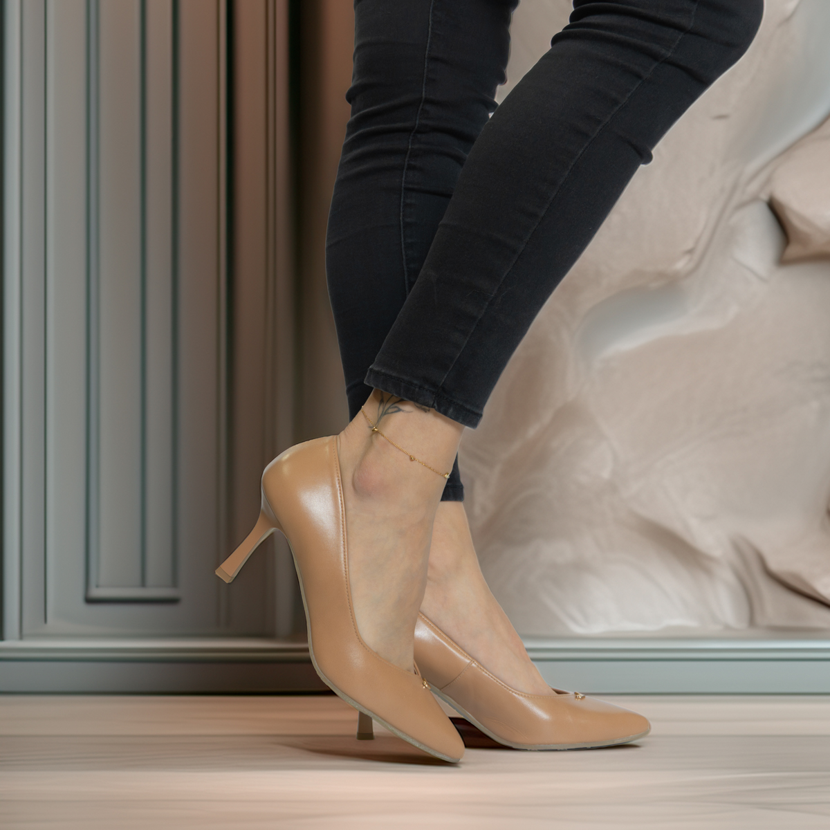 Styl i funkcjonalność: Stabilny 7,5 cm obcas typu szpilka, skóra licowa w kolorze beżowym z ozdobnym detalem, pasujący do eleganckich i casualowych stylizacji.