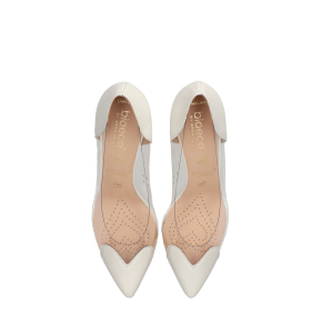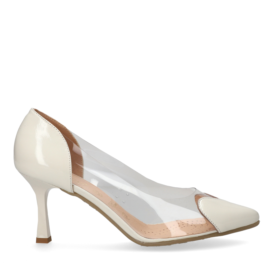 Styl i funkcjonalność: Stabilny 7.5 cm szpilka z transparentną wstawką, skóra lakierowana w kolorze ecru i klasyczny fason, pasujący do eleganckich i casualowych stylizacji.