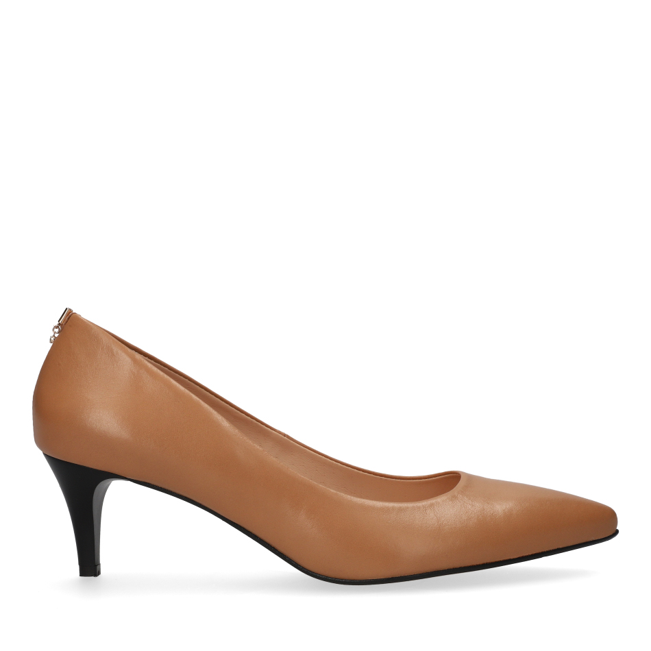 Styl i funkcjonalność: Stabilny 5,5 cm obcas typu szpilka, gładka skóra licowa w kolorze karmelowym oraz ponadczasowy fason z noskiem w szpic. Subtelna ozdoba z tyłu dodaje całości eleganckiego wykończenia i sprawia, że buty świetnie wyglądają zarówno do biura, jak i na wyjścia.