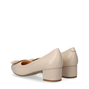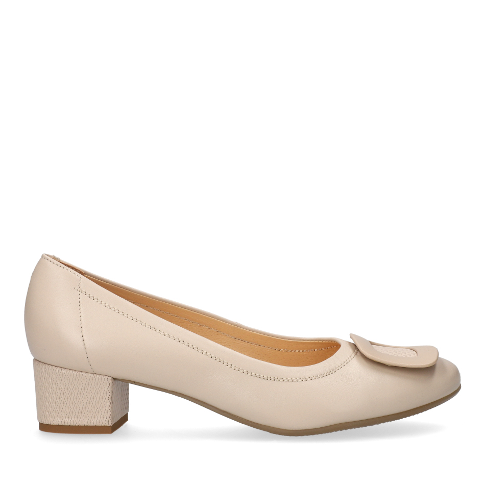 Styl i funkcjonalność: Stabilny 4 cm obcas typu klocek (z modnym, tłoczonym wzorem), ze skóry licowej w kolorze beżowym z ozdobną klamrą na cholewce, pasujący do eleganckich stylizacji.