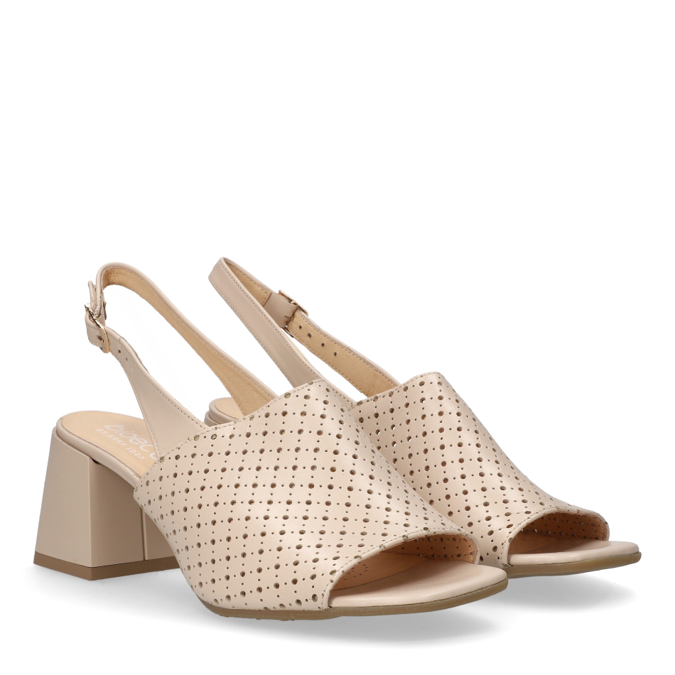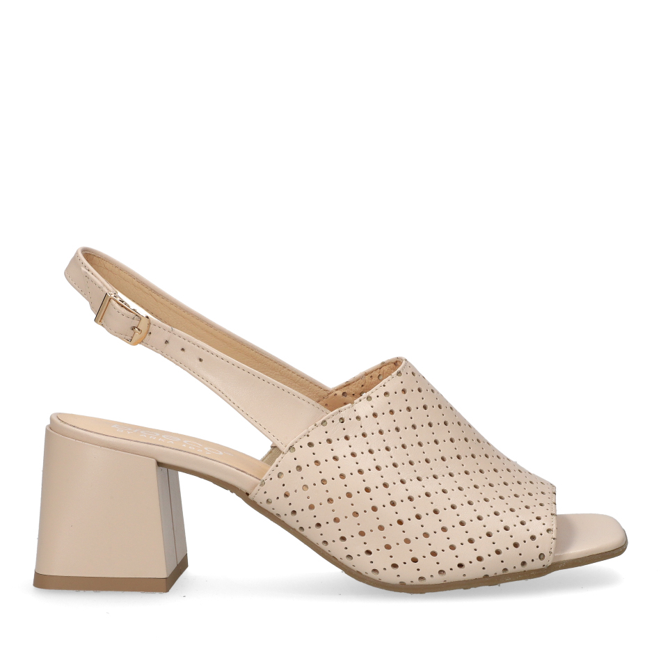 Styl i funkcjonalność: Stabilny 7 cm obcas typu klocek z regulowanym paskiem przy pięcie, skóra licowa perforowana w kolorze beżowym i klasyczny fason, pasujący do eleganckich i casualowych stylizacji.