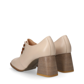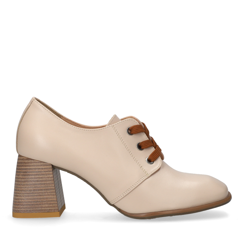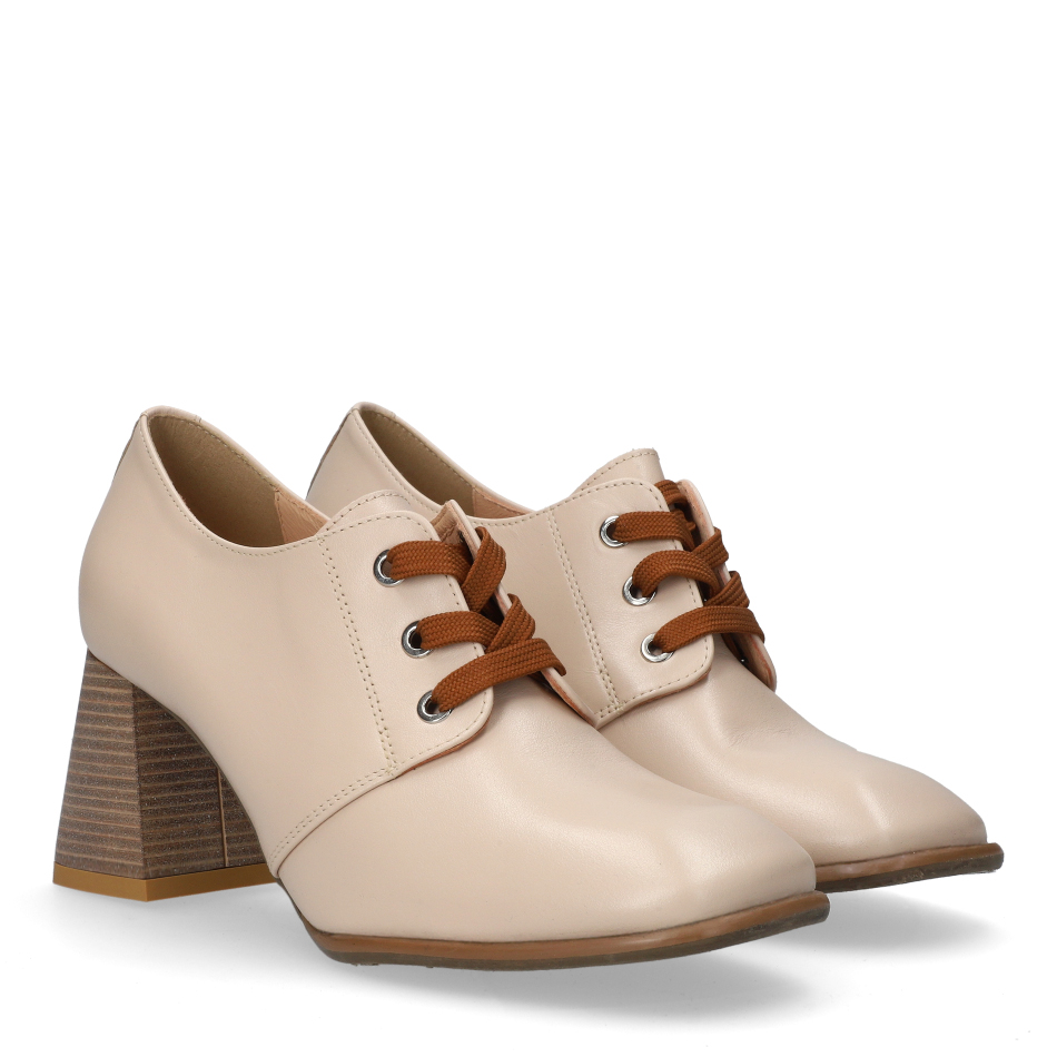 Styl i funkcjonalność: Stabilny 7 cm obcas typu klocek z ozdobnym sznurowaniem i kontrastowymi sznurówkami, skóra licowa w kolorze beżowym i klasyczny fason, pasujący do eleganckich i casualowych stylizacji.