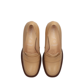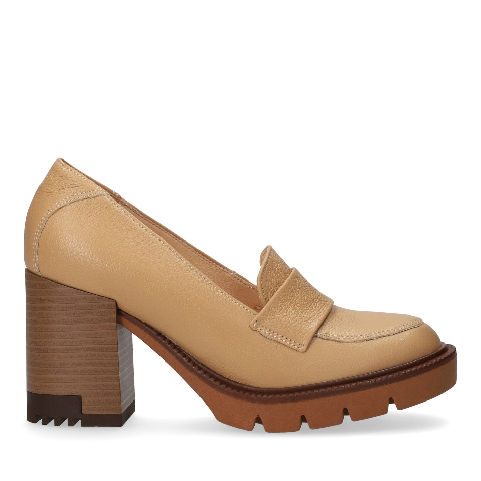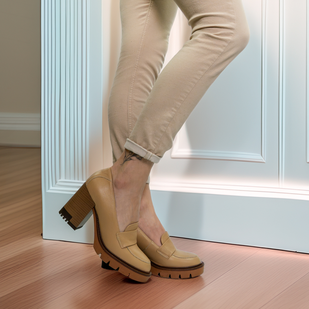 Styl i funkcjonalność: Stabilny 8,5 cm obcas typu klocek osadzony na traperowej podeszwie, skóra licowa w odcieniu jasnego beżu i fason inspirowany loafersami sprawiają, że buty świetnie uzupełnią zarówno eleganckie garnitury, jak i casualowe stylizacje z jeansami czy sukienką.