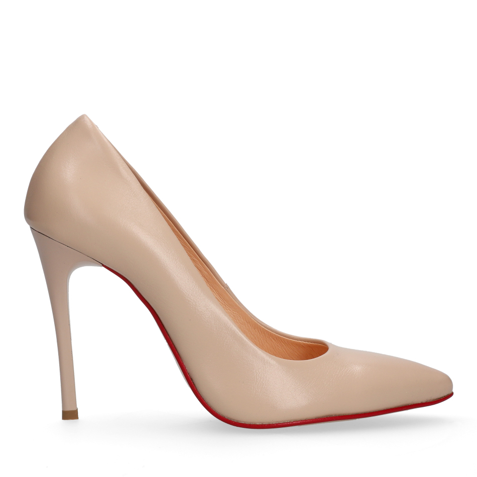 Styl i funkcjonalność: Smukła 10 cm szpilka, skóra licowa w kolorze beżowym oraz klasyczny fason z noskiem w szpic. Kontrastowa czerwona podeszwa dodaje całości luksusowego charakteru i podkreśla wyjątkowy styl.