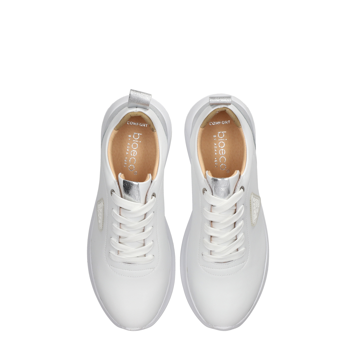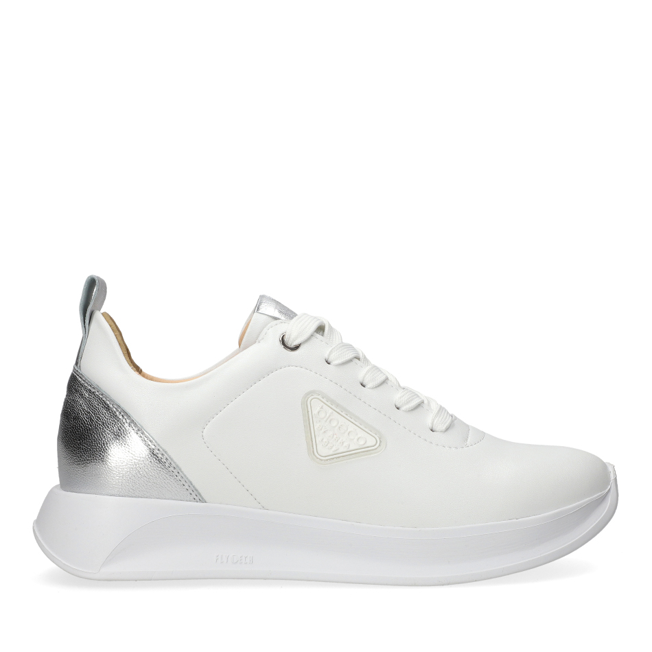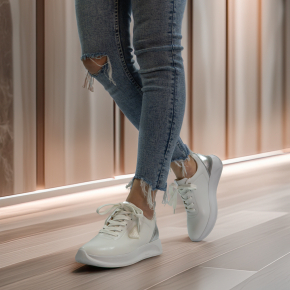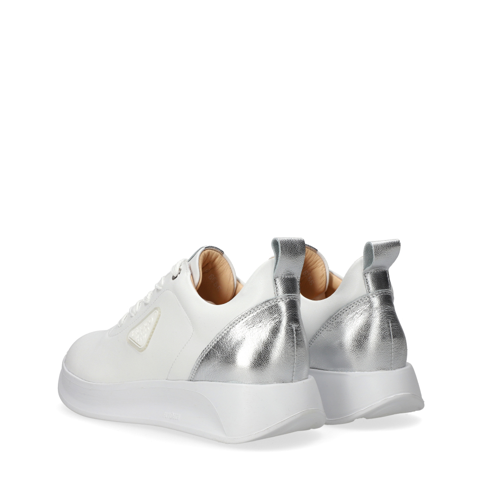 Styl i funkcjonalność: Stabilna 4 cm płaska podeszwa na platformie, skóra licowa w kolorze białym ze srebrnymi wstawkami i nowoczesny fason pasujący do casualowych oraz miejskich stylizacji. Dodatkowo wyjmowana wkładka ułatwia dopasowanie i pielęgnację.