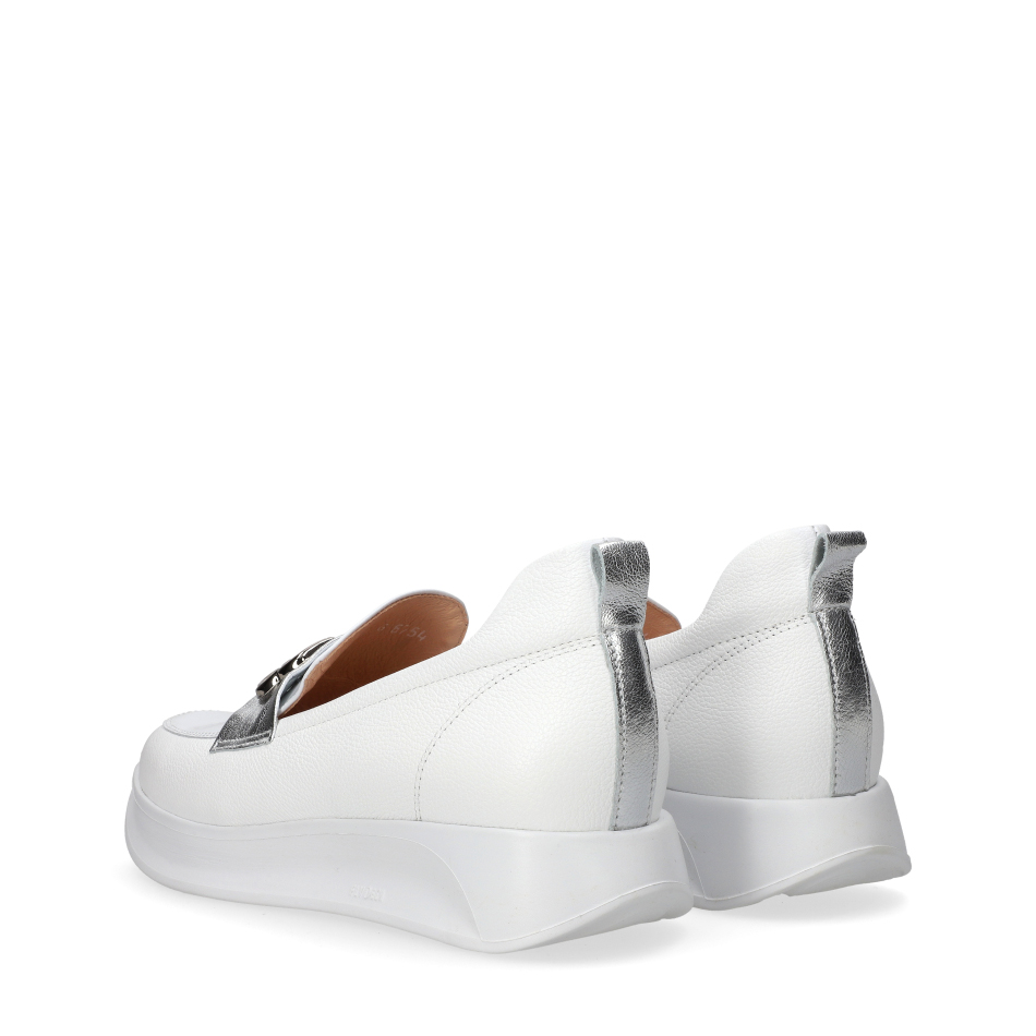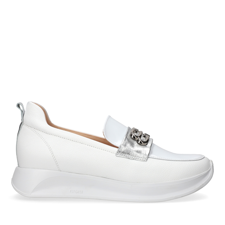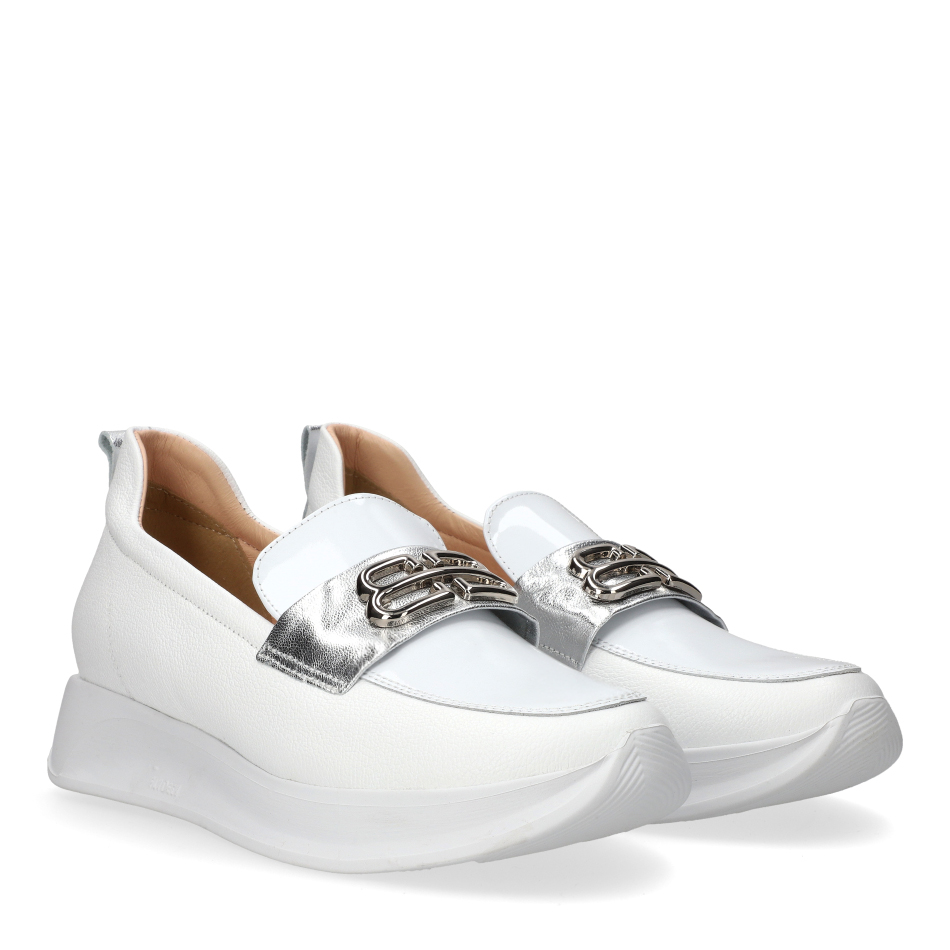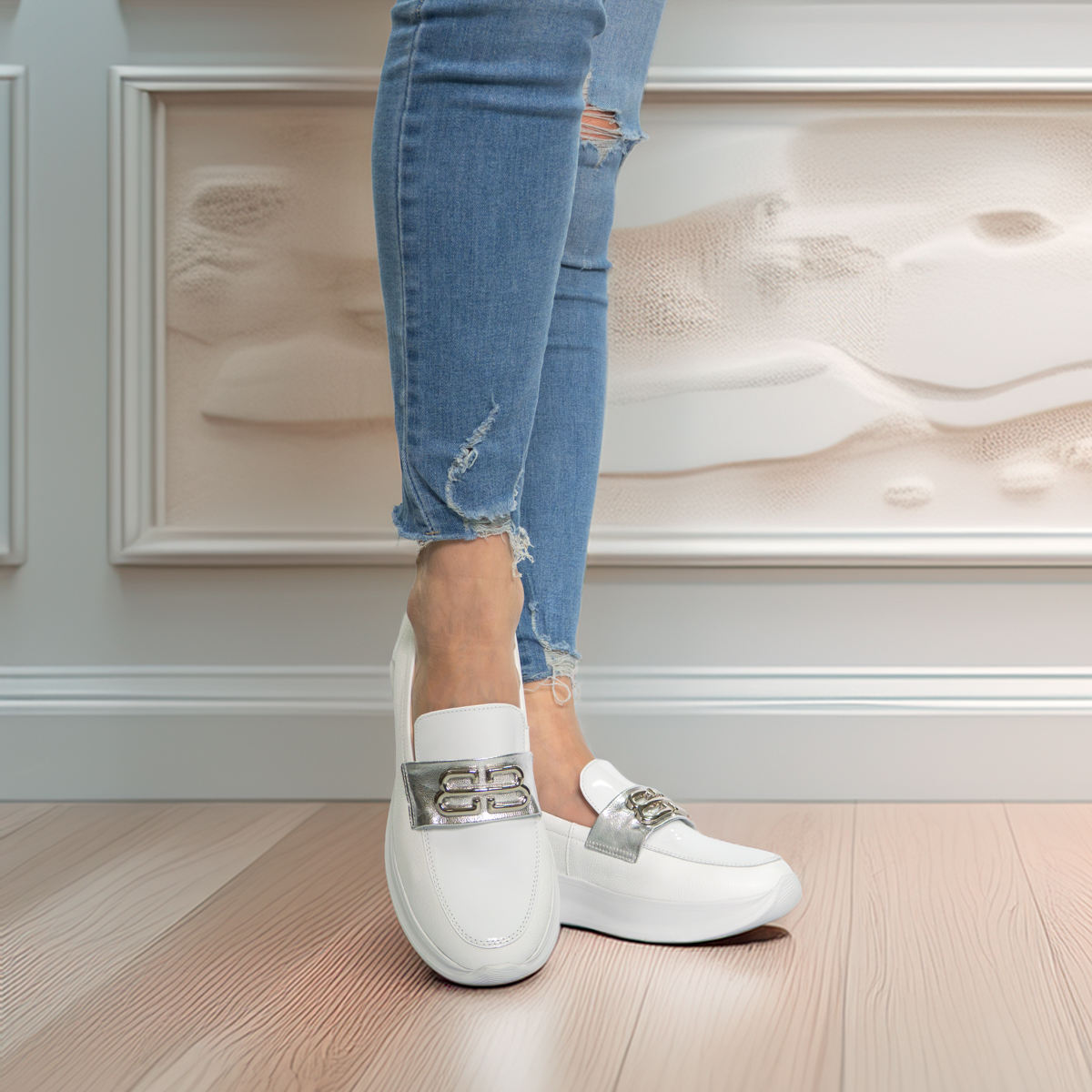 Styl i funkcjonalność: Stabilna, 4 cm płaska podeszwa na platformie, skóra licowa w kolorze białym i klasyczny fason, pasujący do eleganckich i casualowych stylizacji, z ozdobnym łańcuszkiem w kolorze srebrnym. Dodatkowo praktyczna, wyjmowana wkładka.