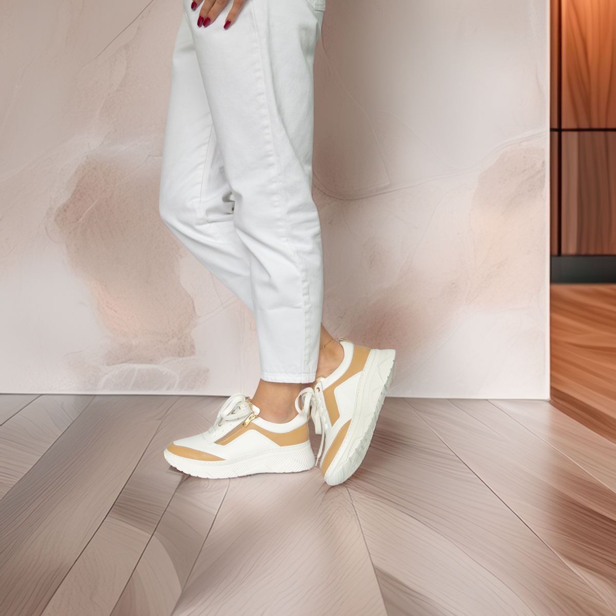 Styl i funkcjonalność: Brak obcasa, skóra licowa w kolorze białym i beżowym z ozdobnym detalem, pasujący do eleganckich i casualowych stylizacji.
