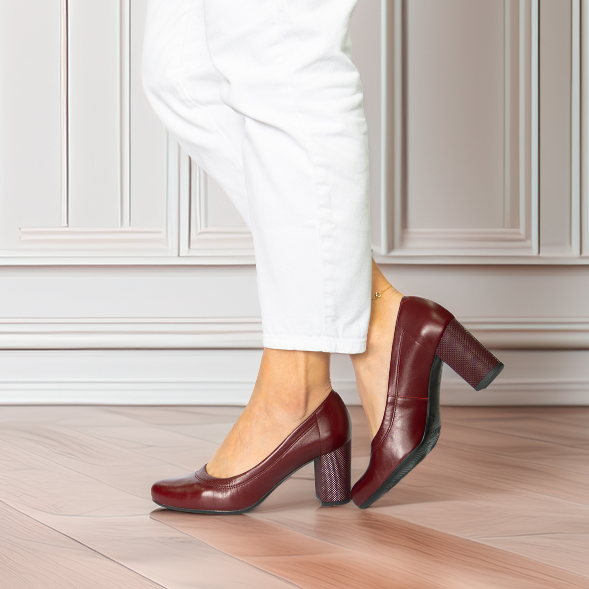 Styl i funkcjonalność: Stabilny 7,5 cm obcas typu słupek, skóra licowa w kolorze bordowym z ozdobnym detalem, pasujący do eleganckich i casualowych stylizacji.