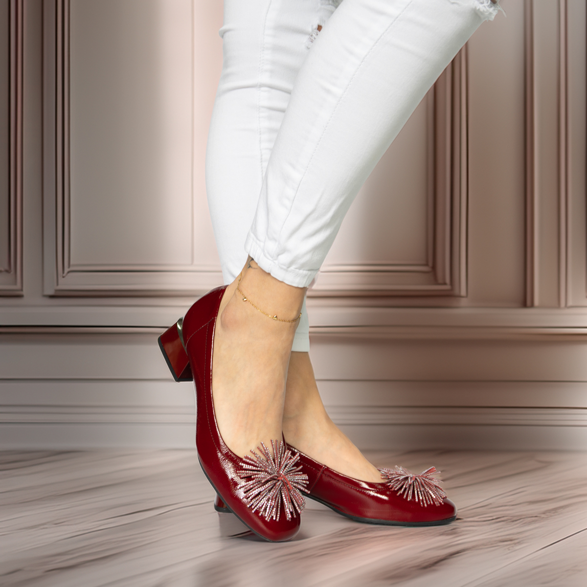 Styl i funkcjonalność: Stabilny 4 cm obcas typu klocek, lakierowana skóra w kolorze bordowym z ozdobnym detalem, pasujący do eleganckich i casualowych stylizacji.