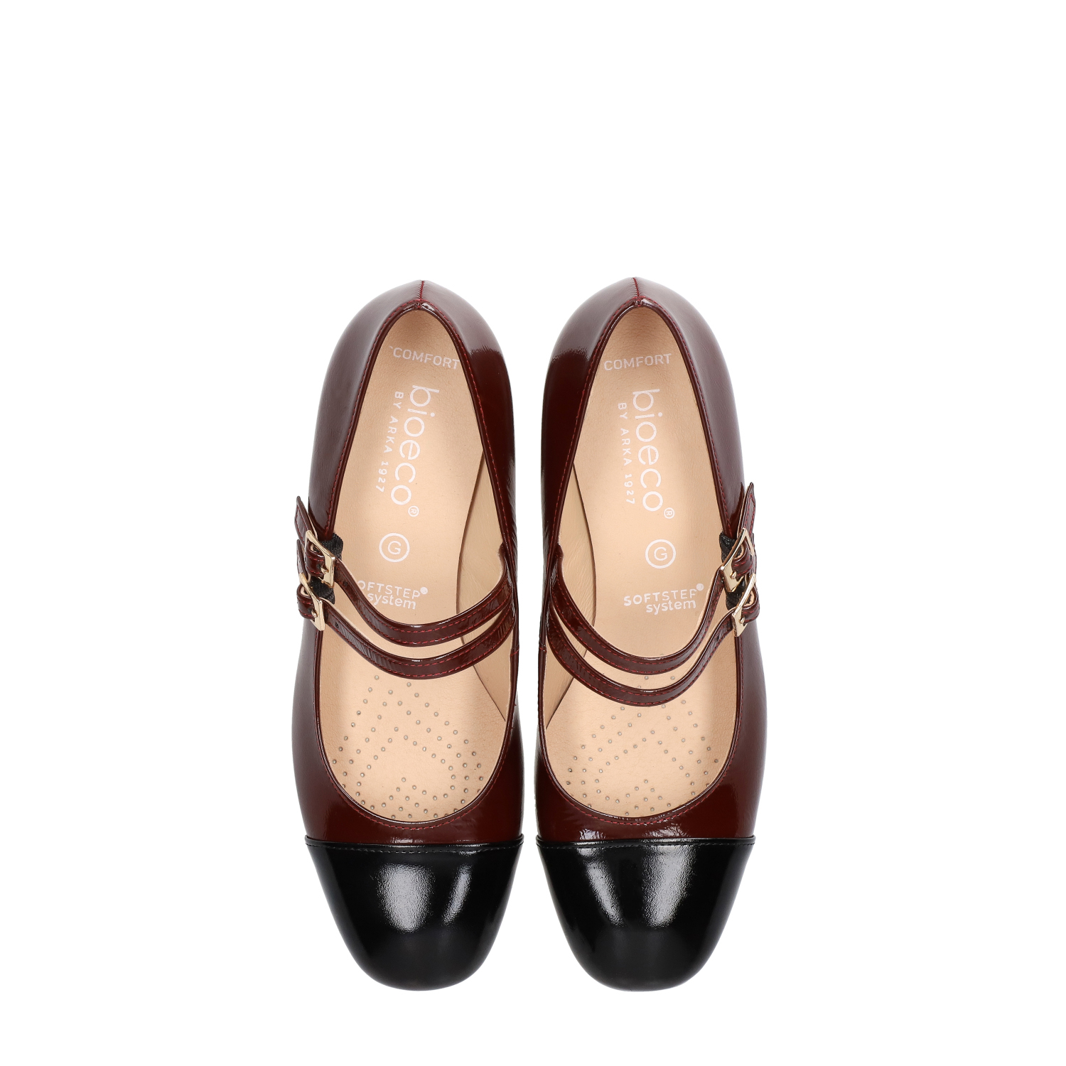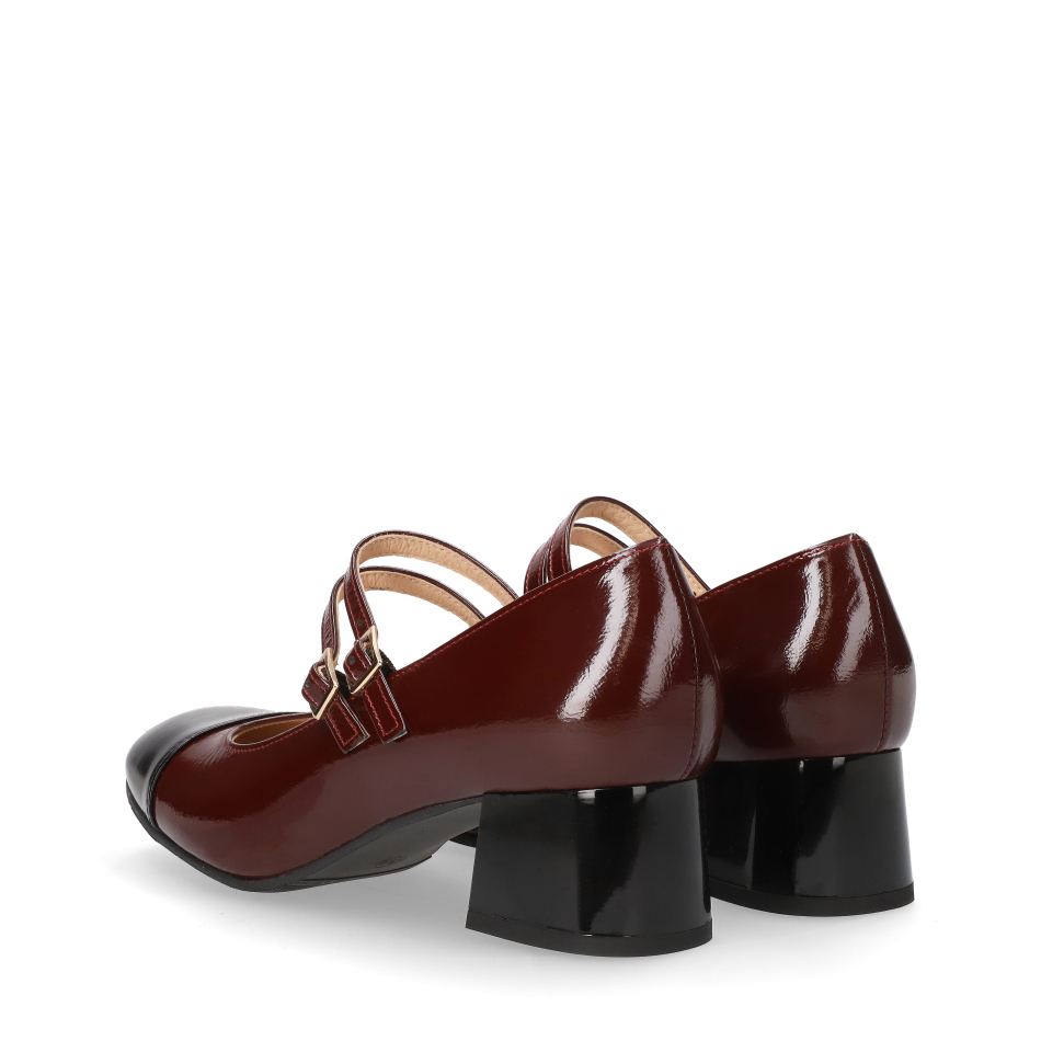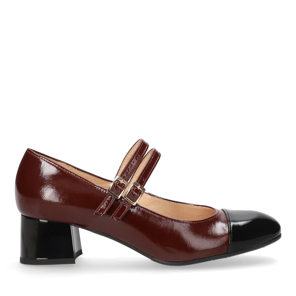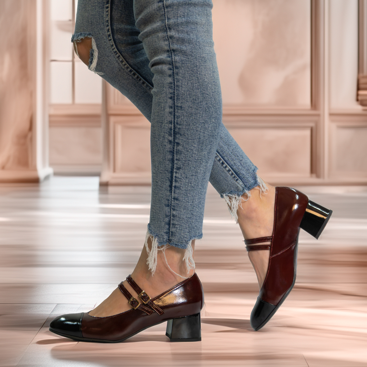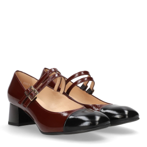 Styl i funkcjonalność: Stabilny 4,5 cm obcas typu klocek z podwójnym paskiem na klamerki i kontrastowym czarnym noskiem, skóra lakierowana w kolorze bordowym z czarnym noskiem i klasyczny fason, pasujący do eleganckich i casualowych stylizacji.