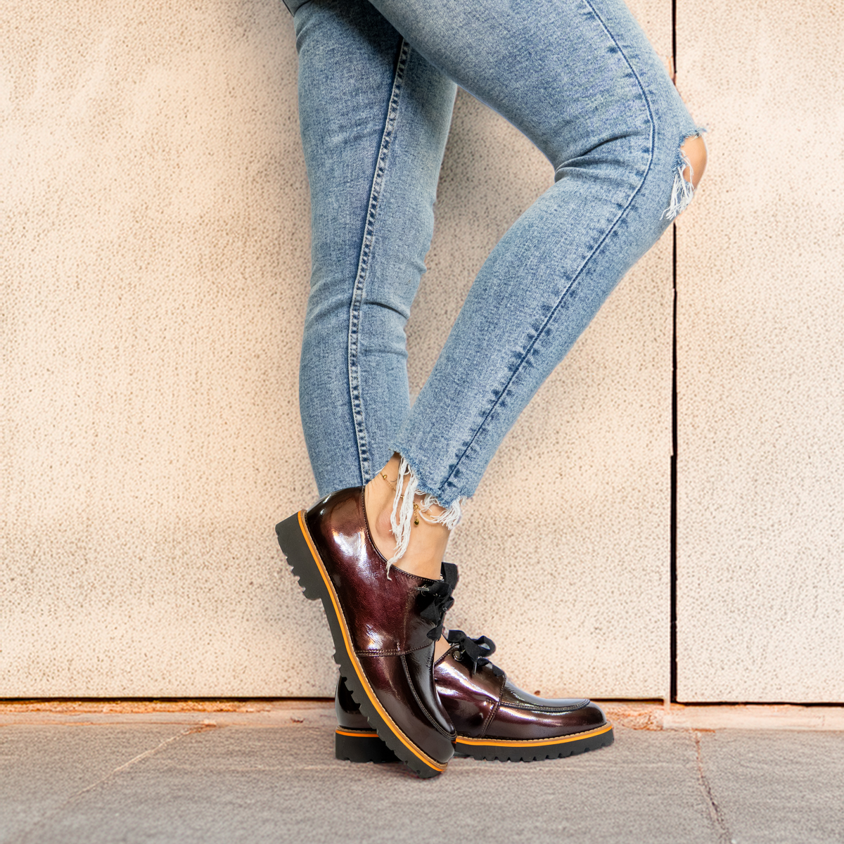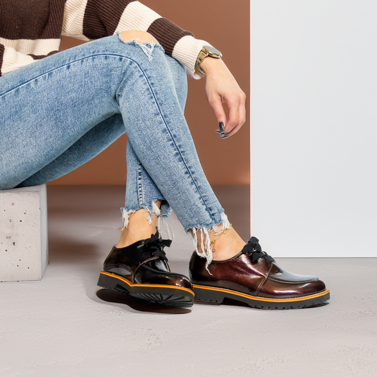 Styl i funkcjonalność: Obuwie w kolorze bordowym z lakierowaną skórą z ozdobnym detalem, pasujące do eleganckich i casualowych stylizacji.