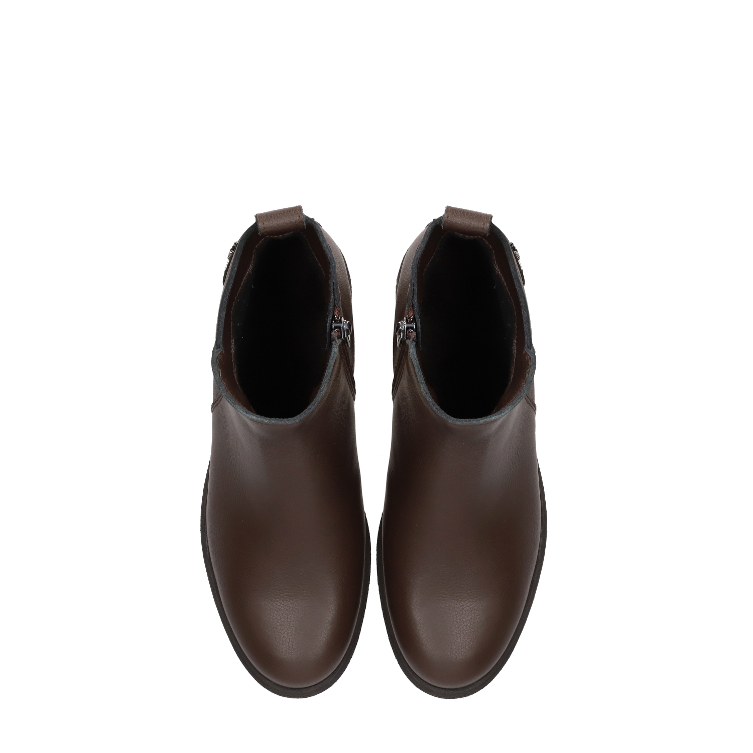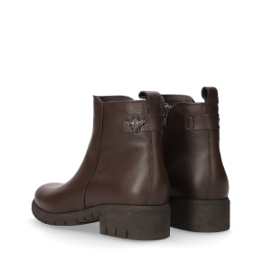 Styl i funkcjonalność: Klasyczny fason botków , wykonany z brązowego grochu z modną ozdobą – metalową pszczołą na pasku.