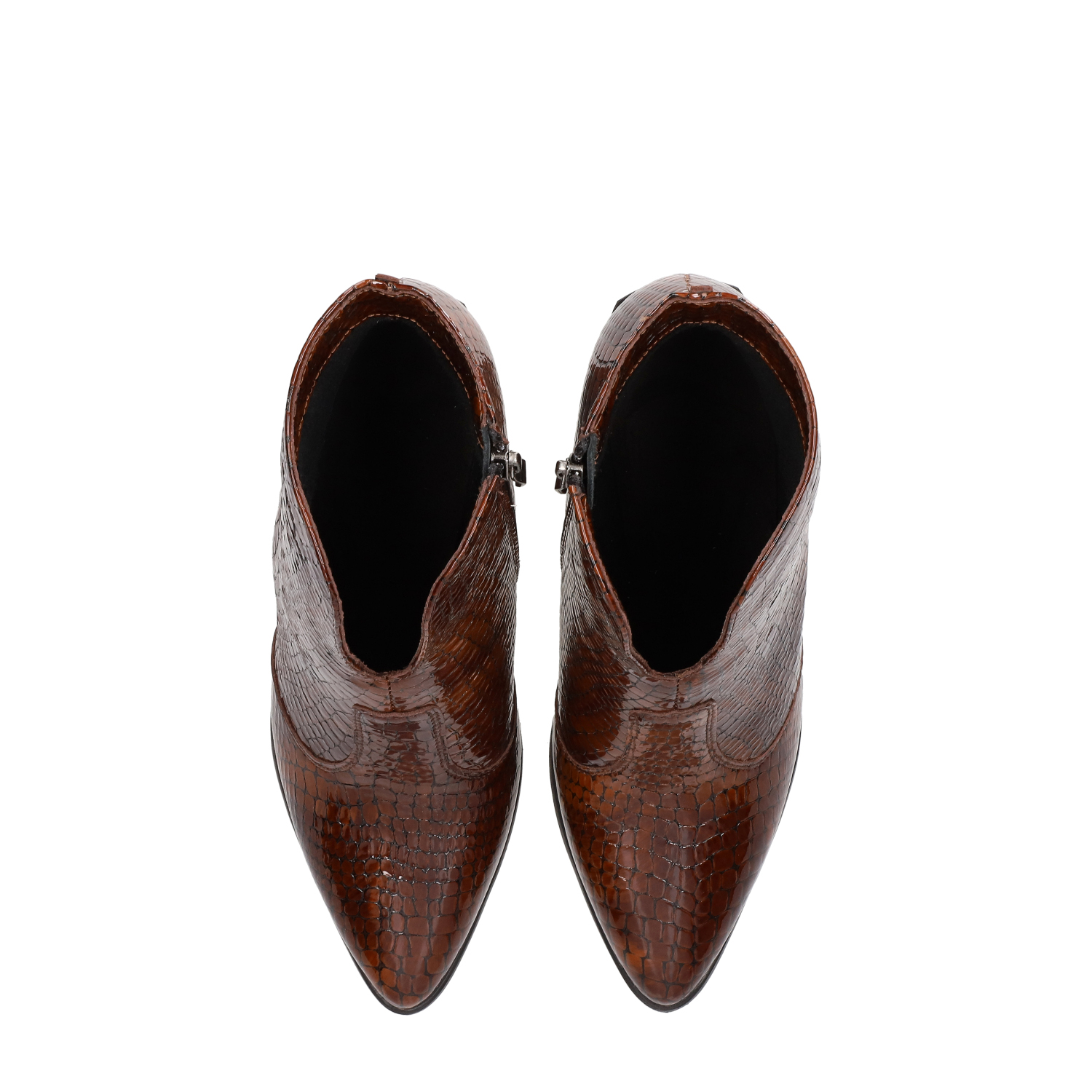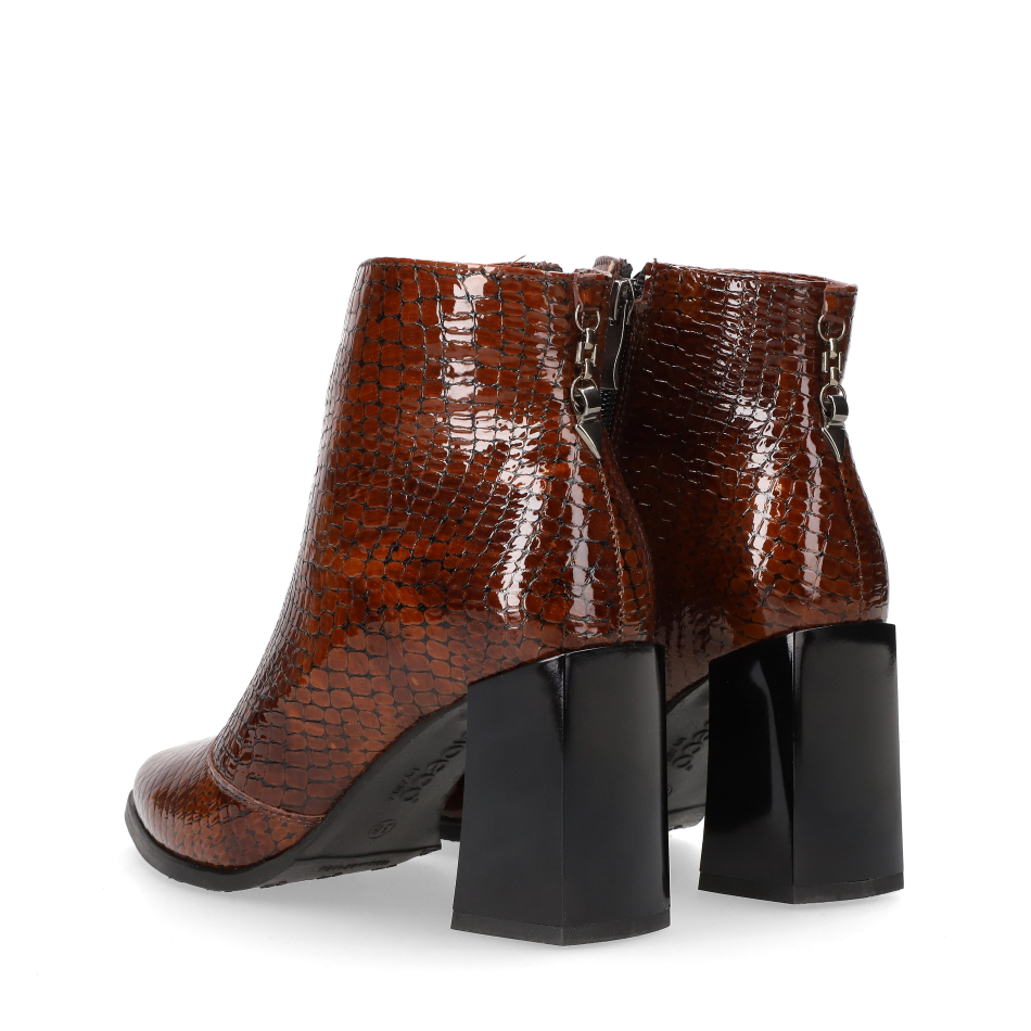 Eleganckie brązowe botki z lakierowanej skóry o tłoczeniu croco – wyrazisty styl i wygoda