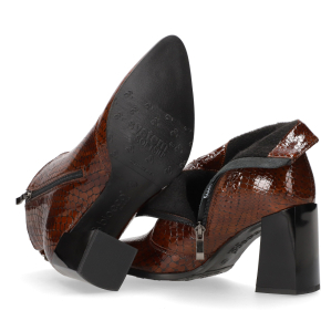 Te brązowe botki wykonane z lakierowanej skóry o efektownym tłoczeniu imitującym skórę krokodyla to świetny wybór dla osób ceniących oryginalny design. Stabilny obcas typu klocek o wysokości 8,5 cm pięknie podkreśla sylwetkę, zapewniając wygodne noszenie na co dzień i na wyjątkowe okazje. Zapięcie z tyłu ułatwia zakładanie, a całość modelu powstała w Polsce z wysokiej jakości, przebadanych materiałów.
