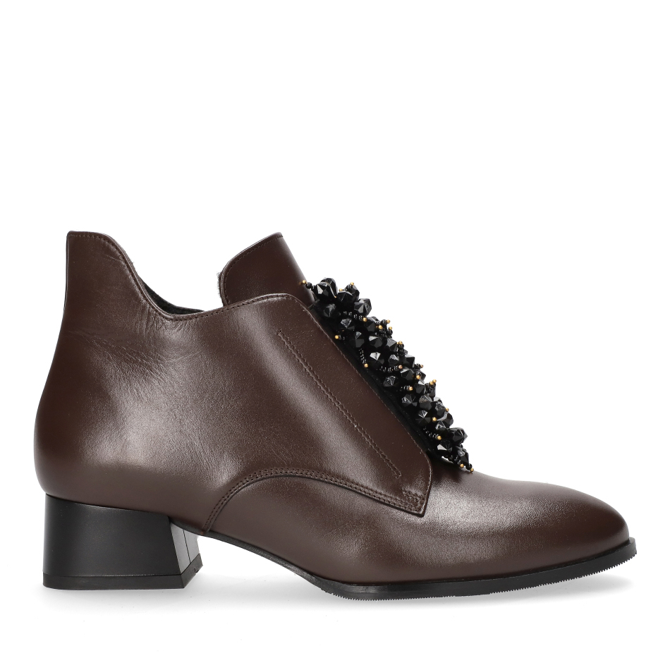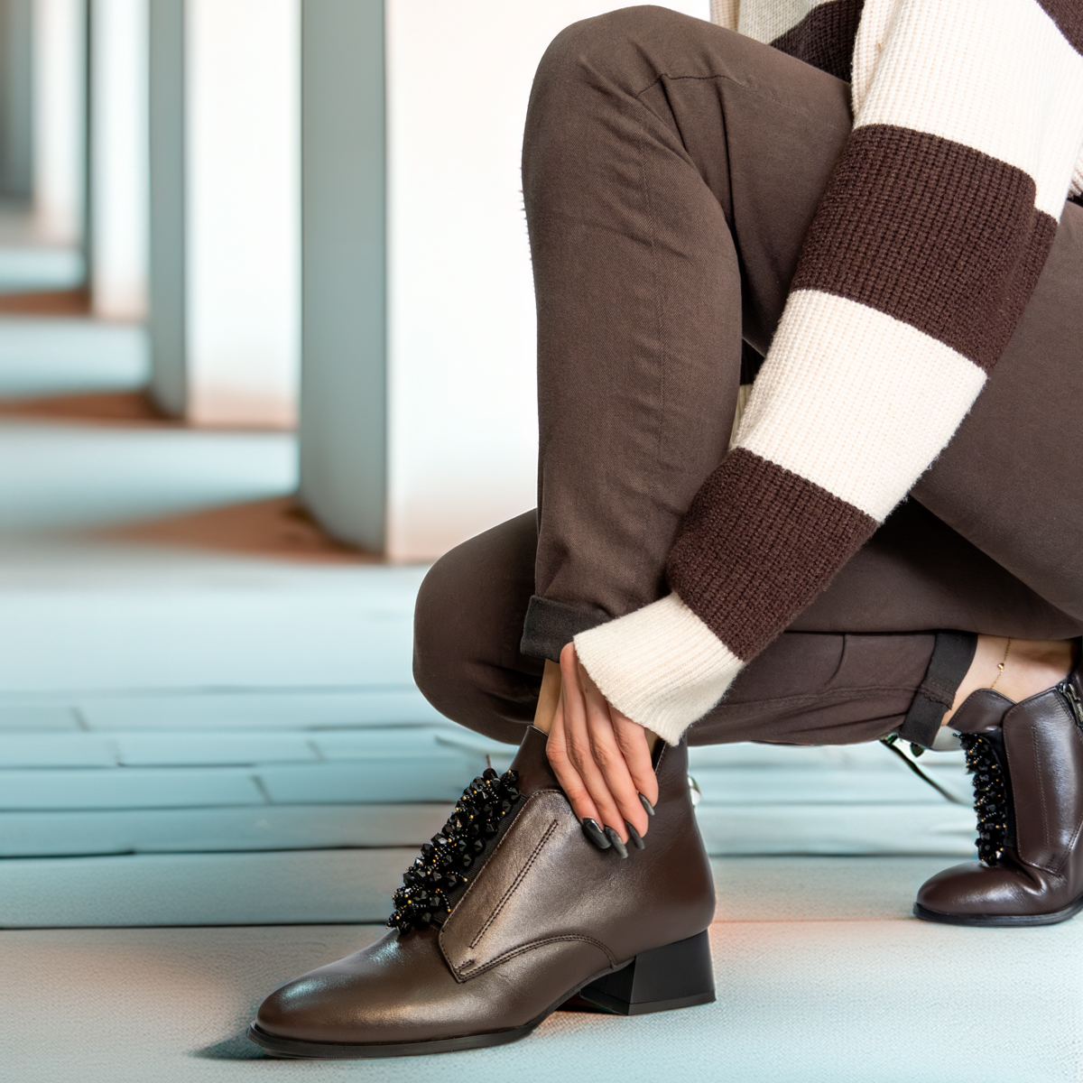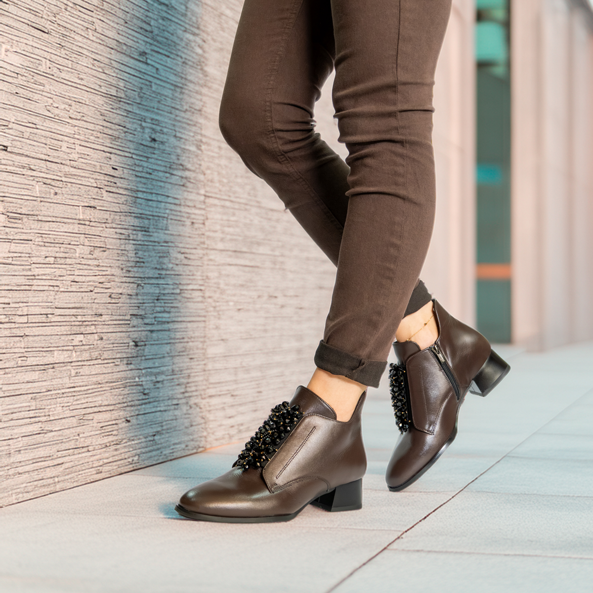 Styl i funkcjonalność: Stabilny 4 cm obcas typu klocek, skóra licowa w kolorze brązowym z ozdobnym detalem (kryształki), pasujący do eleganckich i casualowych stylizacji.