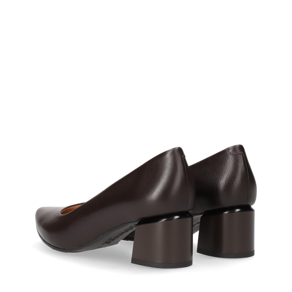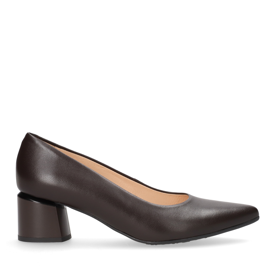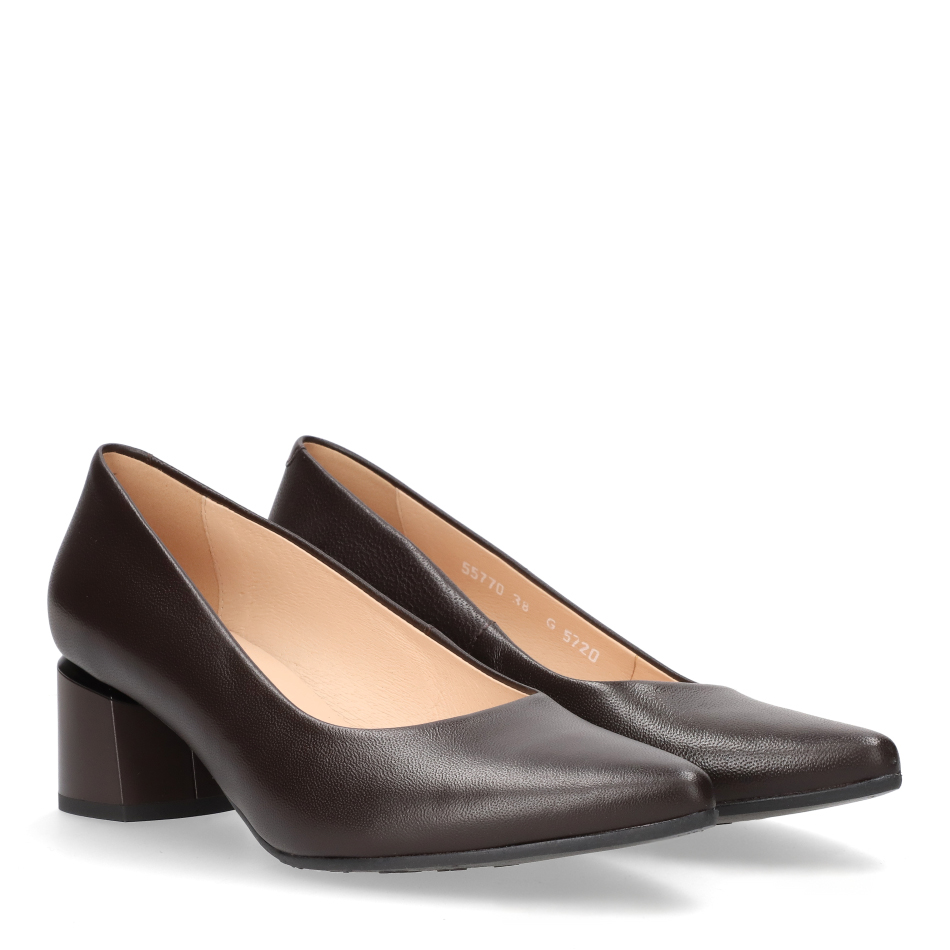 Styl i funkcjonalność: Stabilny 5 cm obcas typu klocek, skóra licowa w kolorze brązowym i klasyczny, smukły fason z delikatnie szpiczastym noskiem, pasujący do eleganckich i casualowych stylizacji.