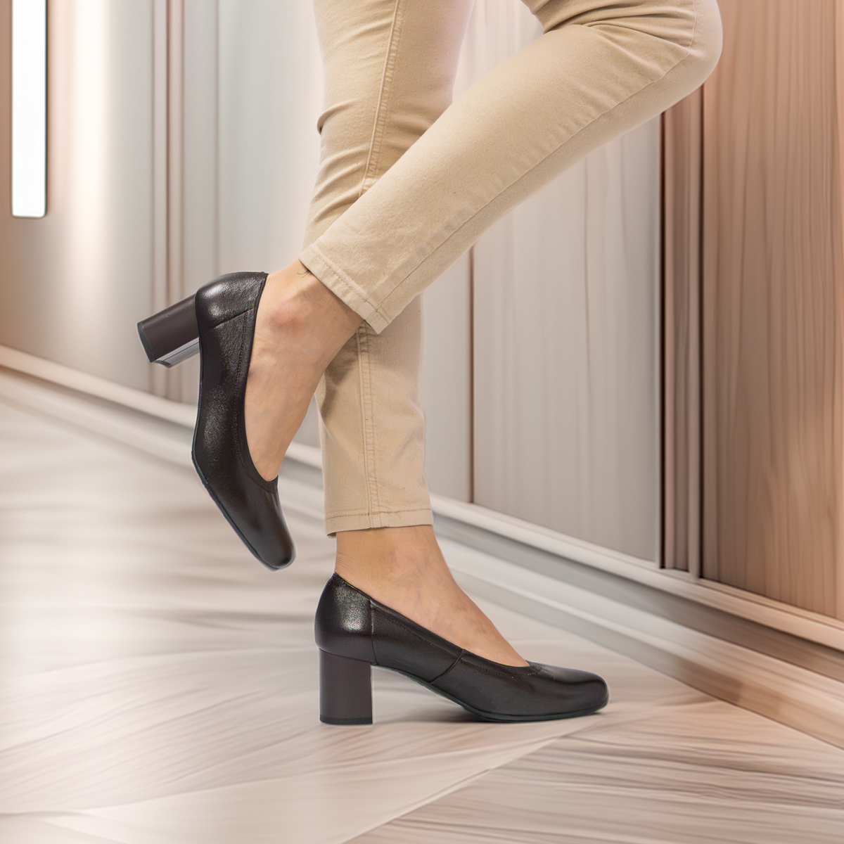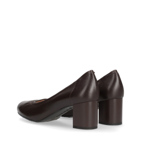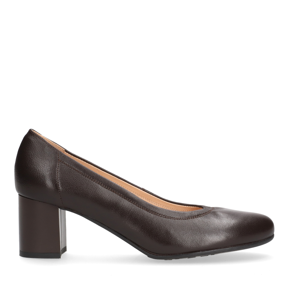 Styl i funkcjonalność: Stabilny 5 cm obcas typu klocek, skóra licowa w kolorze brązowym i klasyczny fason, pasujący do eleganckich i casualowych stylizacji.