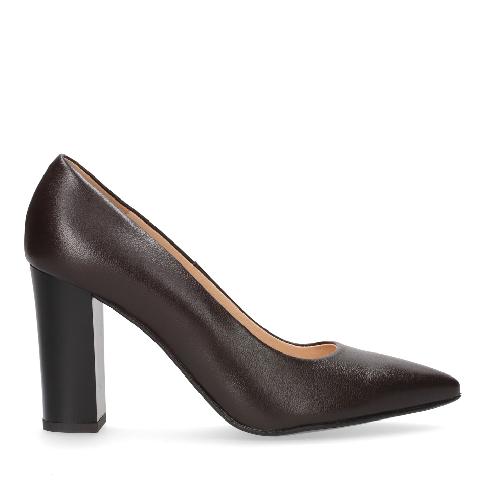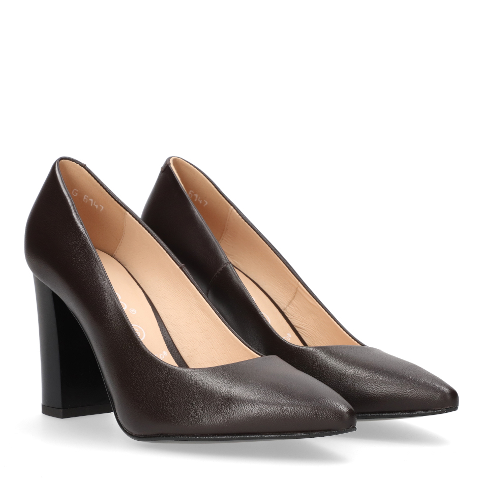 Styl i funkcjonalność: Stabilny 10 cm obcas typu słupek, skóra licowa w kolorze brązowym i klasyczny, smukły fason z ostrym noskiem, pasujący do eleganckich i casualowych stylizacji.