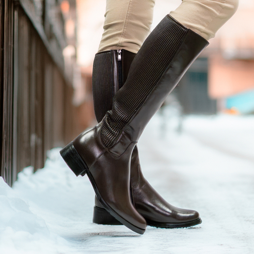 Moje nowe skórzane kozaki zimowe z ocieploną cholewką, są klasyczne, eleganckie i super wygodne, a dzięki elastycznej powierzchni tylnej części cholewki, buty świetnie dopasowują się do grubości mojej łydki - i w rajstopach i w spodniach typu cygaretki.