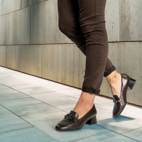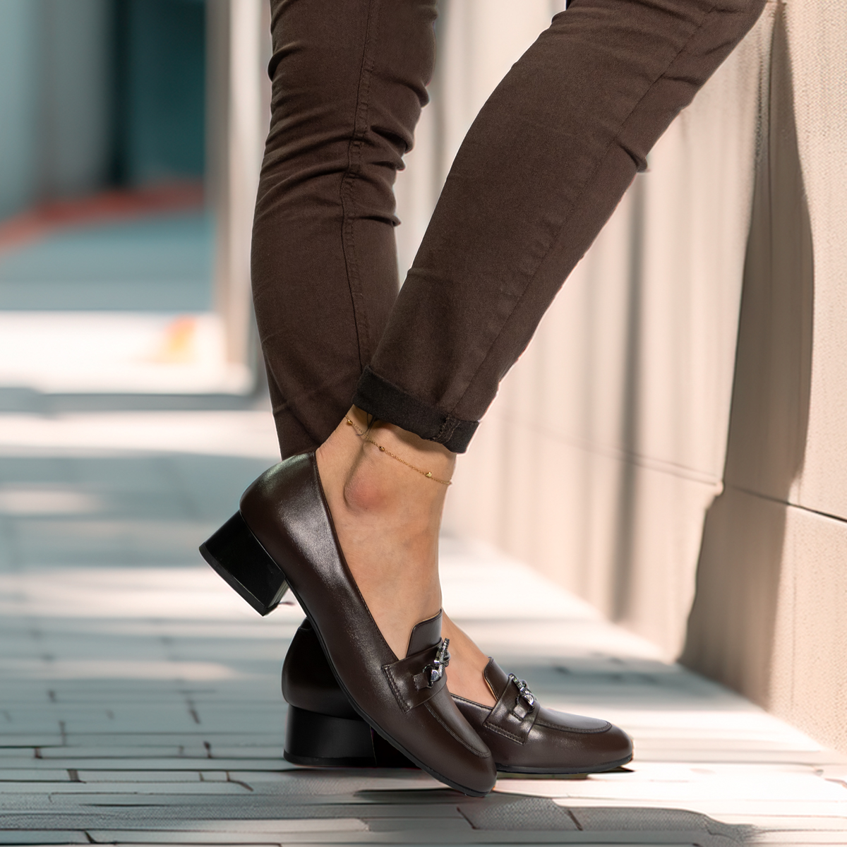 Styl i funkcjonalność: Stabilny 4 cm obcas typu klocek, skóra licowa w kolorze brązowym z ozdobnym detalem, pasujący do eleganckich i casualowych stylizacji.