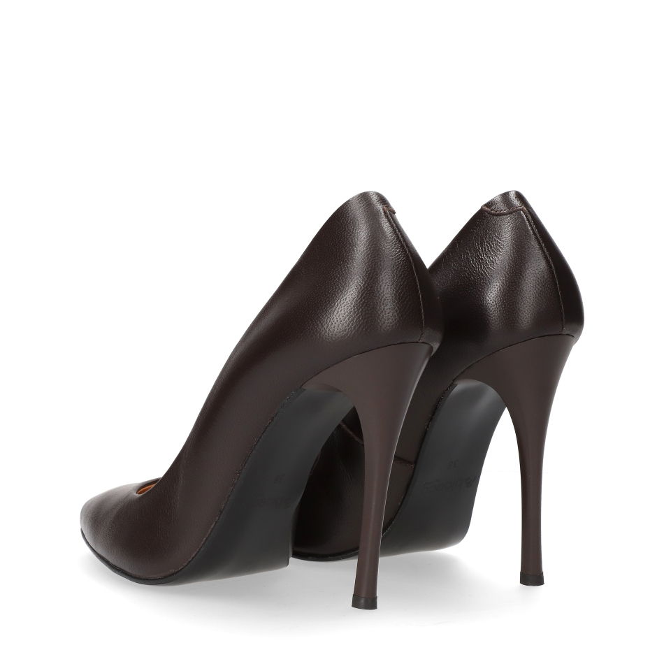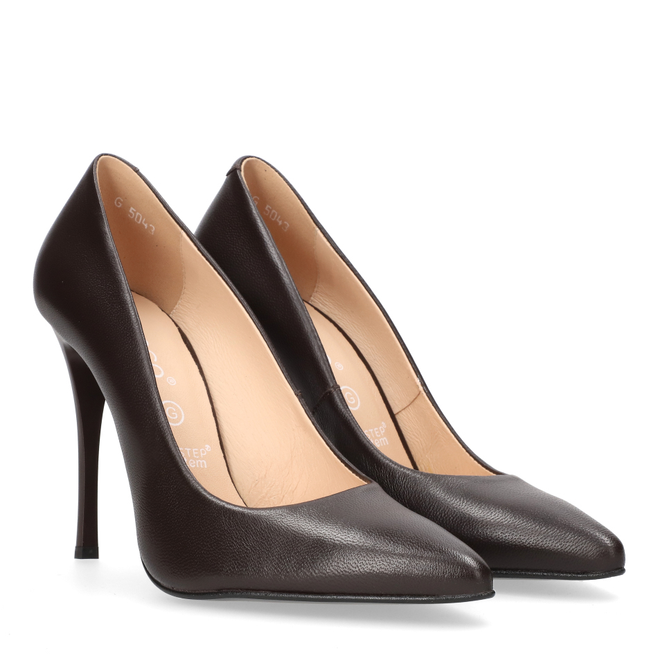 Styl i funkcjonalność: Smukła 10 cm szpilka, skóra licowa w kolorze brązowym i klasyczny, zmysłowy fason z ostrym noskiem, pasujący do eleganckich i wieczorowych stylizacji.