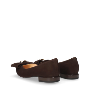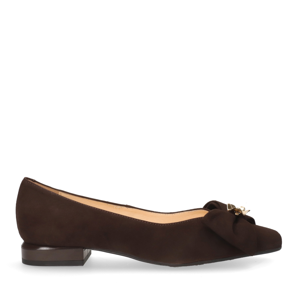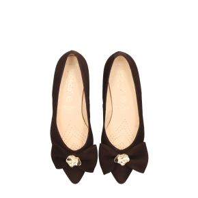 Styl i funkcjonalność: Stabilny 2 cm niski obcas typu klocek z ozdobną kokardą i metalowym detalem, skóra nubukowa w kolorze brązowym i klasyczny fason, pasujący do eleganckich i casualowych stylizacji.