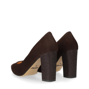 Styl i funkcjonalność: Stabilny 9 cm obcas typu słupek, wykonany z zamszu w kolorze brązowym, pasujący do eleganckich stylizacji.