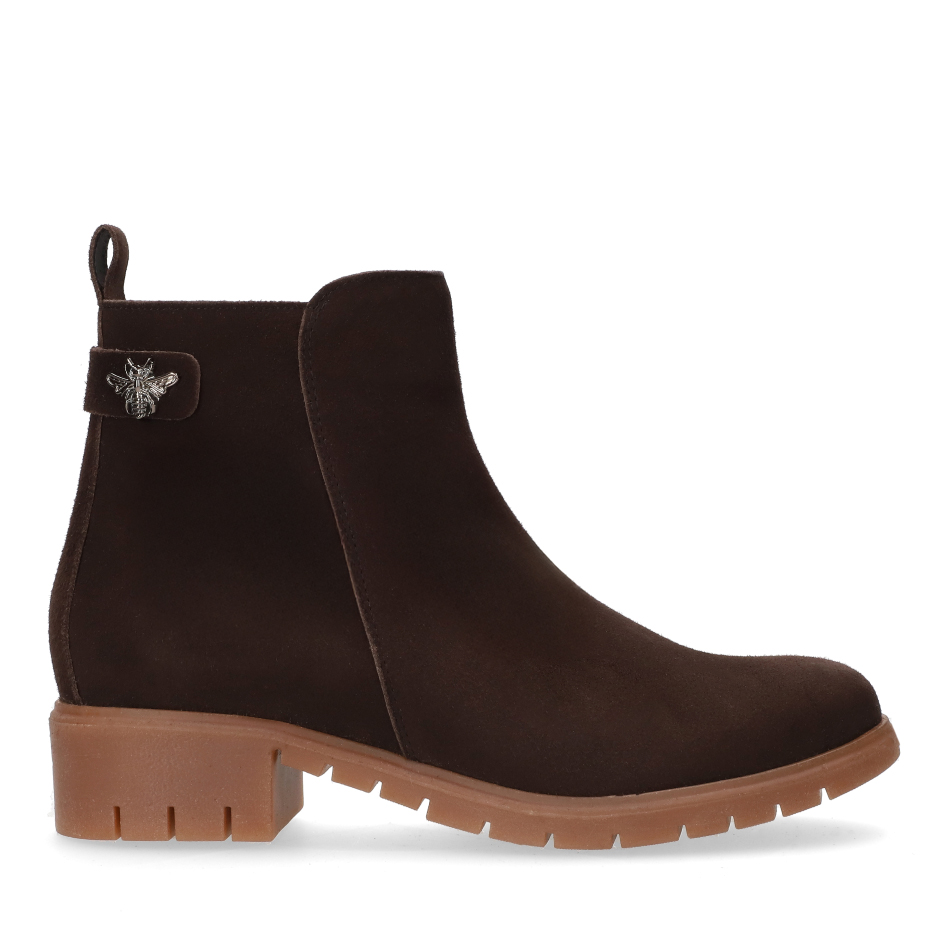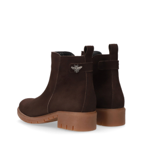 Styl i funkcjonalność: Klasyczny fason botków , wykonany z brązowego weluru z modną ozdobą – metalową pszczołą na pasku.