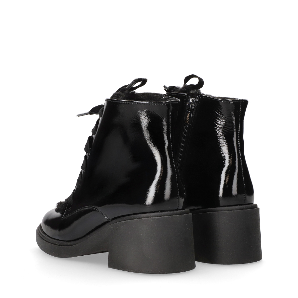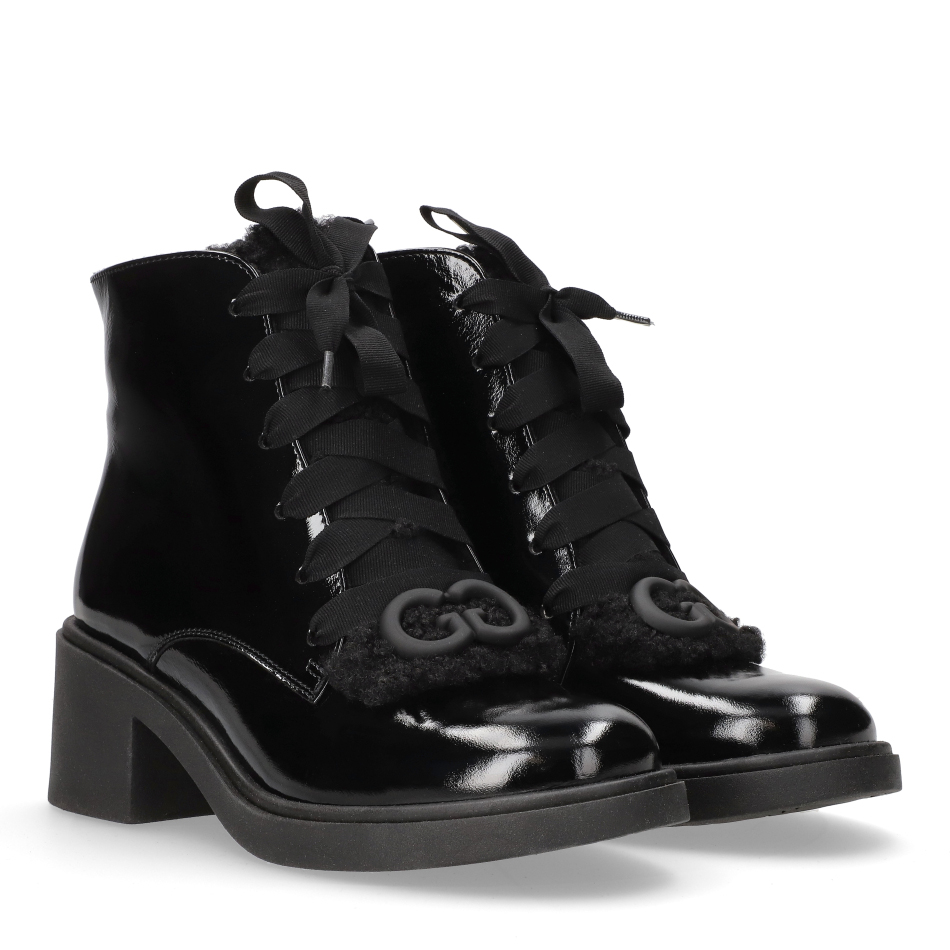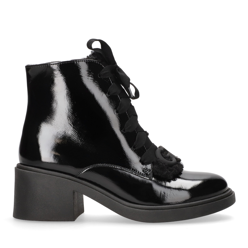 Botki w głębokim, czarnym kolorze to połączenie wyrazistego połysku lakierowanej skóry z komfortem na co dzień. Wyprodukowane w Polsce z wysokogatunkowych materiałów, zapewniają trwałość oraz bezpieczeństwo dla skóry. Obcas typu klocek o wysokości 6,5 cm to gwarancja stabilności i wygody nawet przy dłuższym noszeniu.