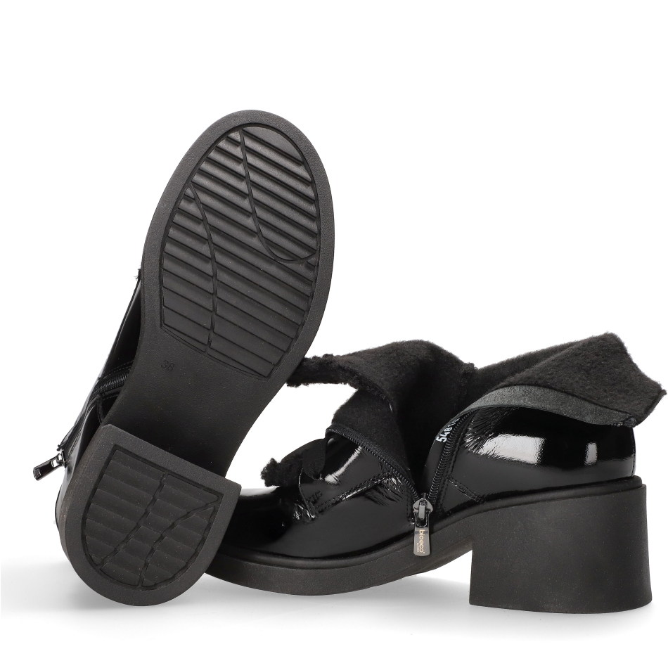 Klasyczny fason – czarny lakierowany materiał połączony z obcasem typu klocek o wysokości 6,5 cm to modny wygląd i wygoda noszenia.