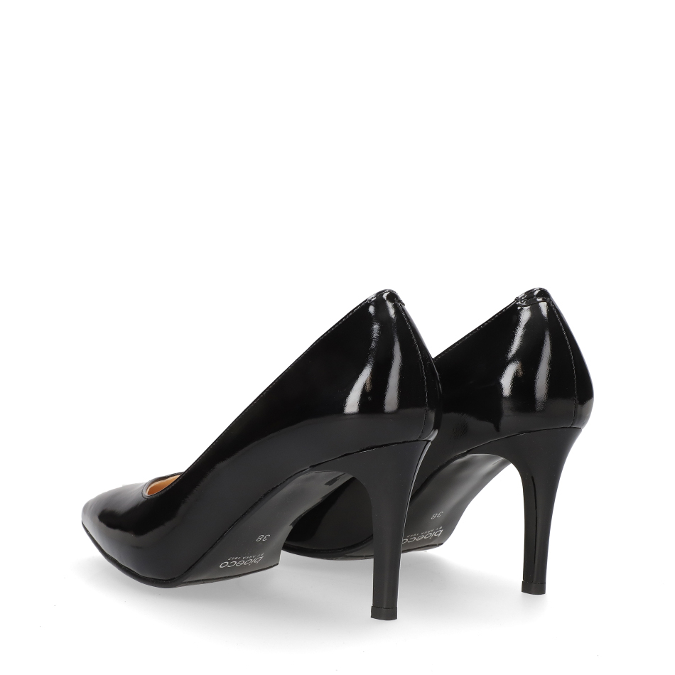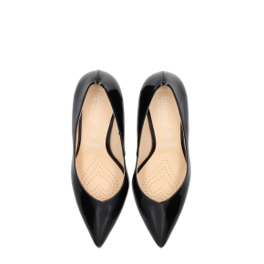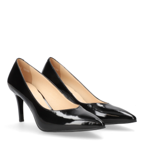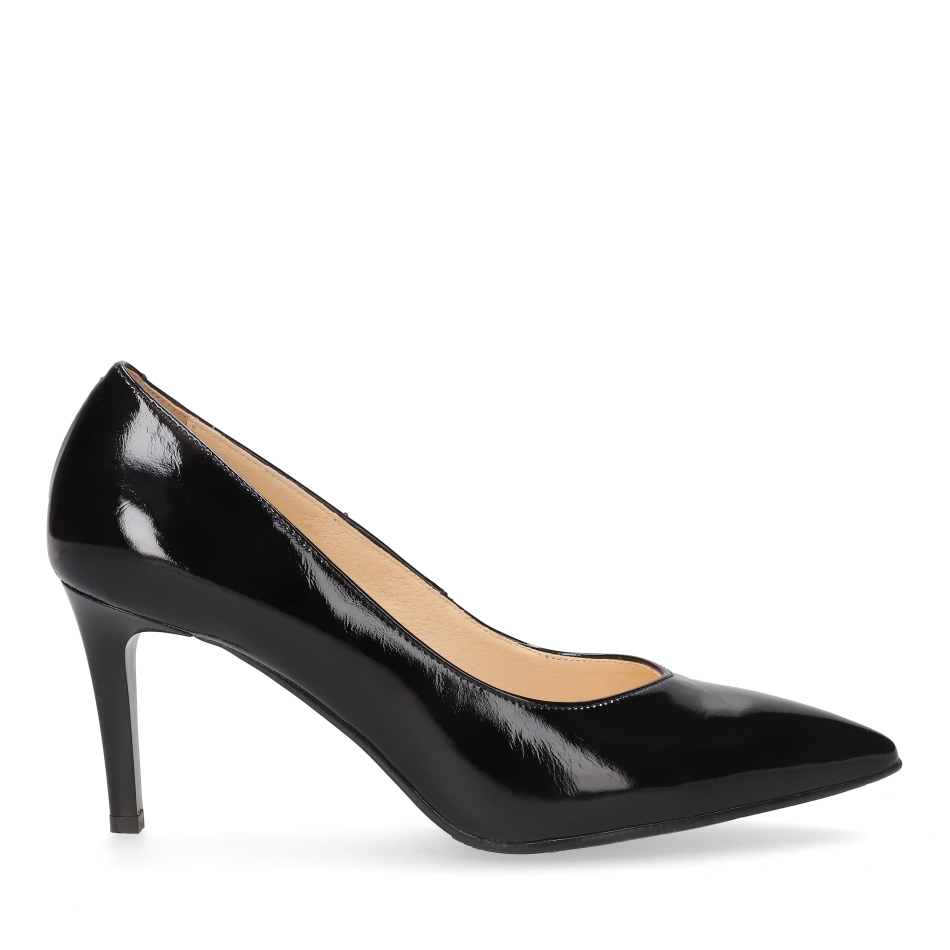 Styl i funkcjonalność: Stabilny 7 cm obcas typu szpilka, spiczasty nosek, skóra lakierowana w kolorze czarnym i klasyczny fason, pasujący do eleganckich i wieczorowych stylizacji.