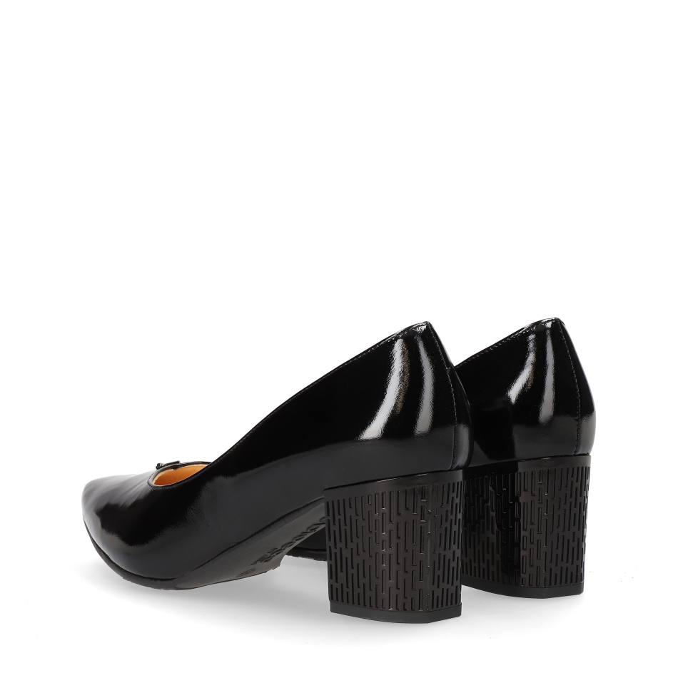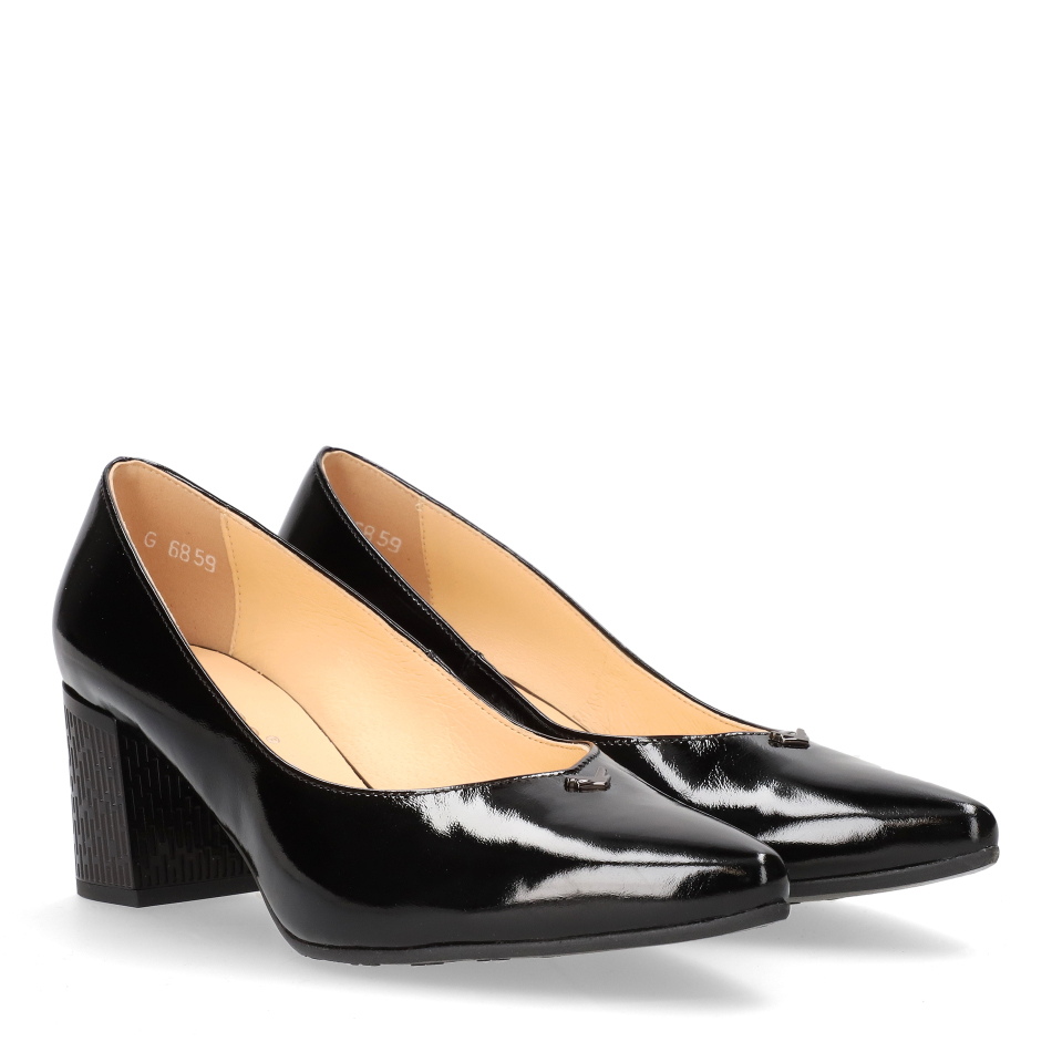 Klasyczny fason – czarny lakier połączony z obcasem typu słupek o wysokości 6 cm daje nie tylko modny wygląd, ale i wygodę noszenia.