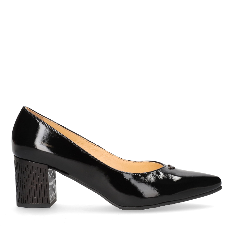 Eleganckie czarne czółenka z lakierowanej skóry na obcasie typu słupek – styl, wygoda i polska jakość