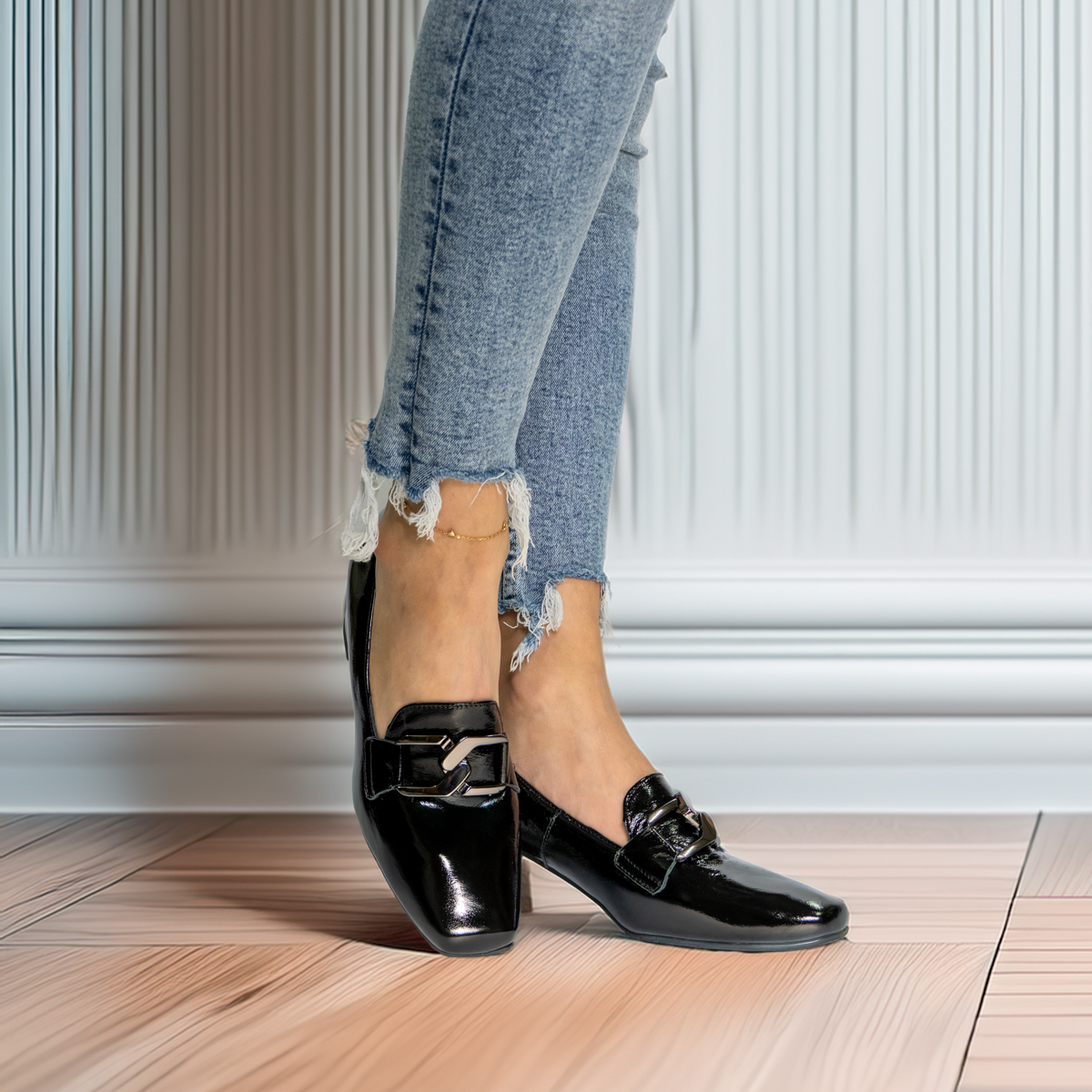Styl i funkcjonalność: Stabilny 5 cm obcas typu klocek, lakierowana skóra w kolorze czarnym z ozdobną klamrą na cholewce, pasujący do eleganckich i casualowych stylizacji.