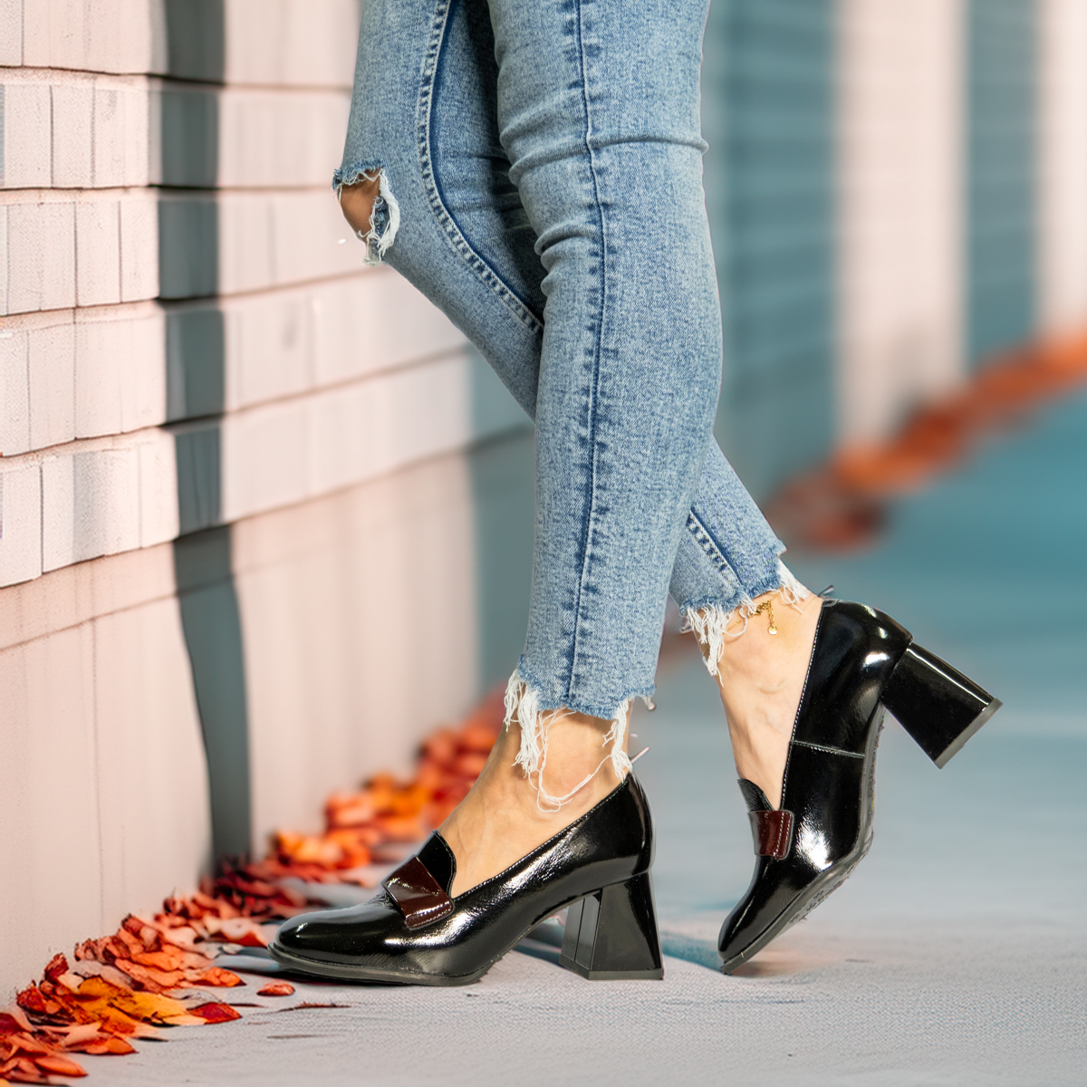 Te klasyczne mokasyny na obcasie w głębokiej czerni, wykonane z lakierowanej skóry, łączą ponadczasową elegancję z modnym designem, zapewniając wyjątkowy komfort. Dzięki polskiej produkcji, wysokiej jakości materiałom i innowacyjnemu systemowi Soft Step, to idealny wybór do pracy, na spotkania lub na specjalne okazje, gdy potrzebujesz stabilnego i eleganckiego obuwia.