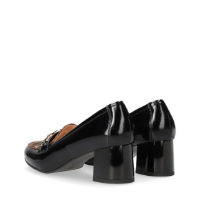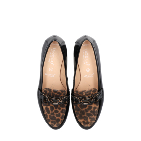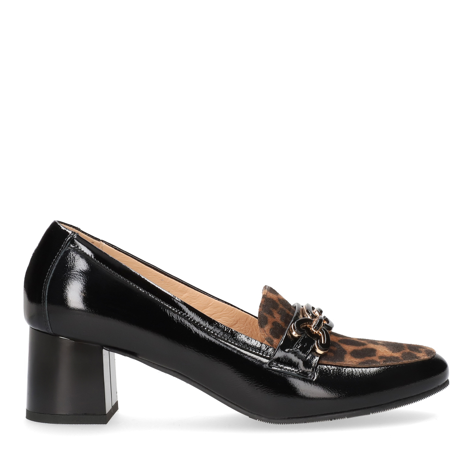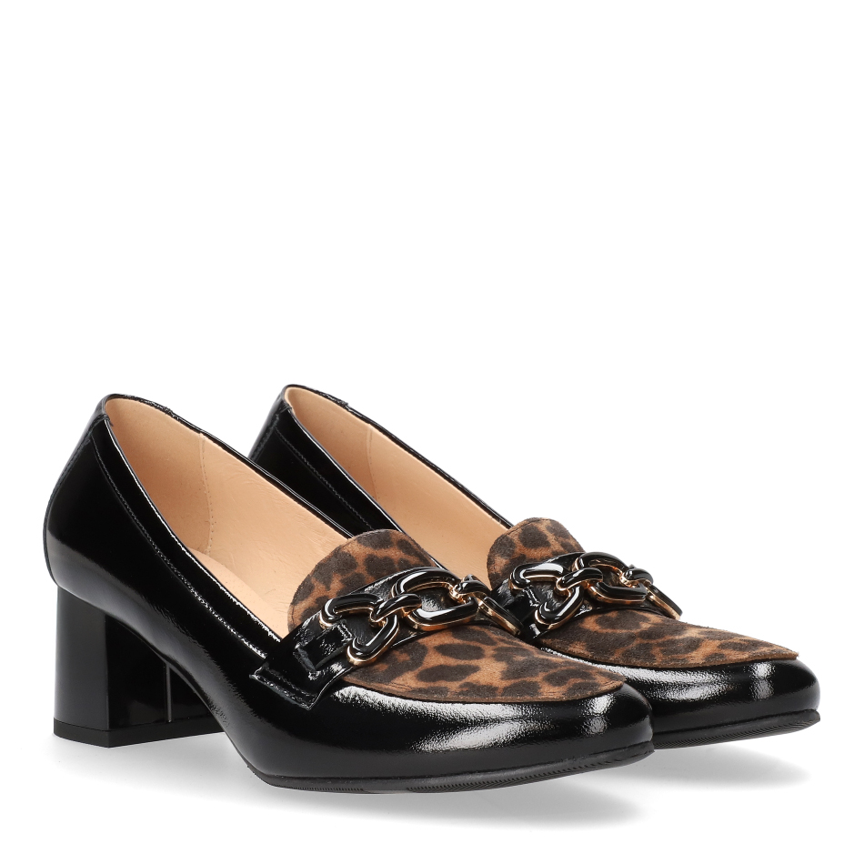 Eleganckie Półbuty – Czarny Lakier z Akcentem Panterki i Złotym Łańcuchem