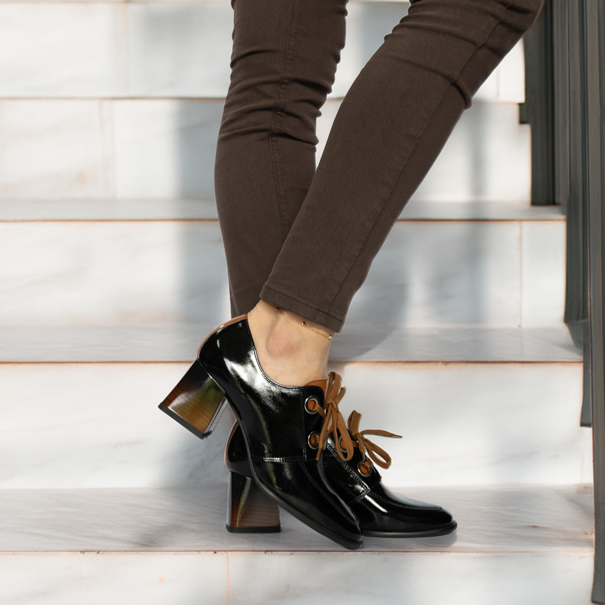 Styl i funkcjonalność: Stabilny 6 cm obcas typu klocek, lakierowana skóra w kolorze czarnym z ozdobnym detalem, pasujący do eleganckich i casualowych stylizacji.