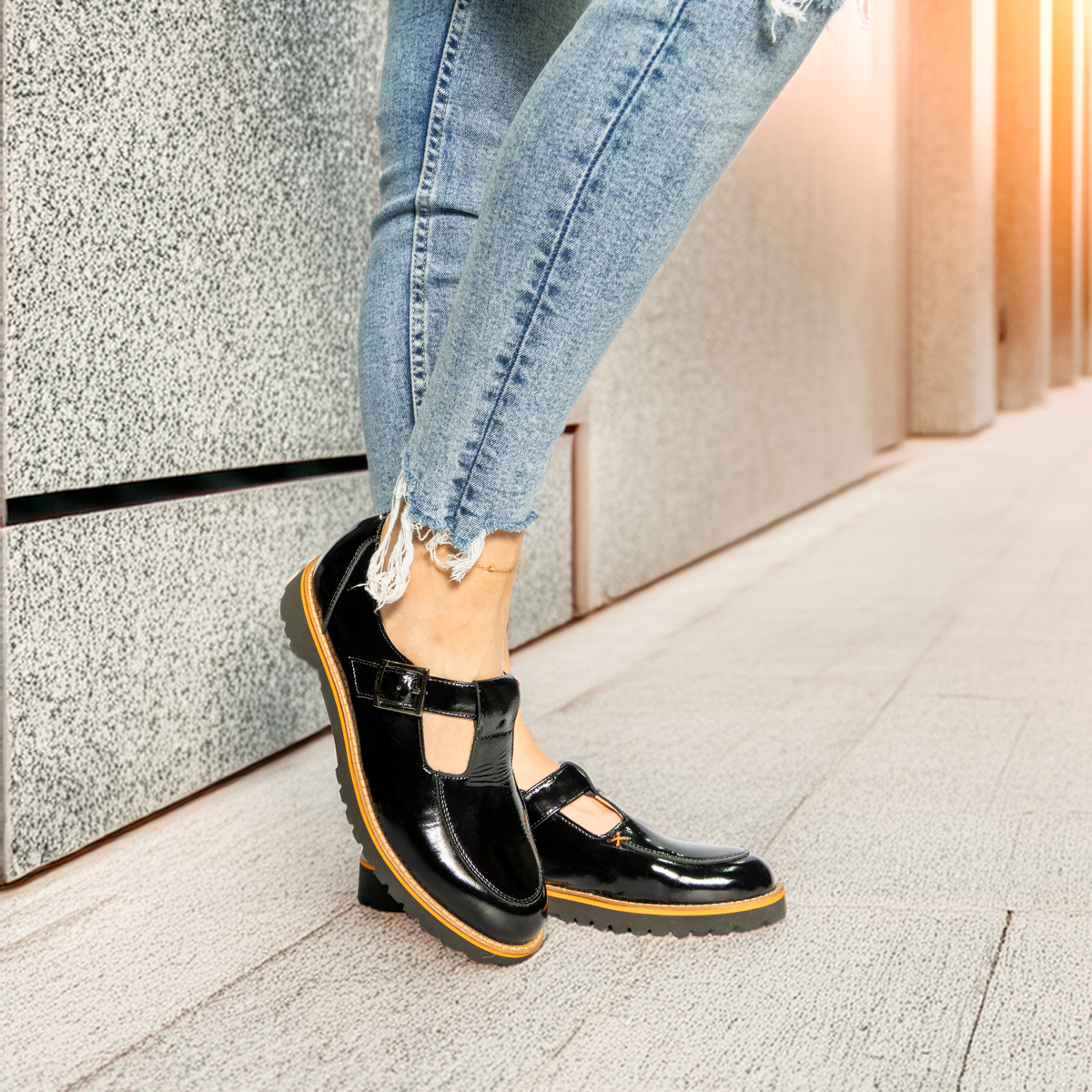 Styl i funkcjonalność: Obuwie w kolorze czarnym z lakierowaną skórą z ozdobnym detalem, pasujące do eleganckich i casualowych stylizacji.
