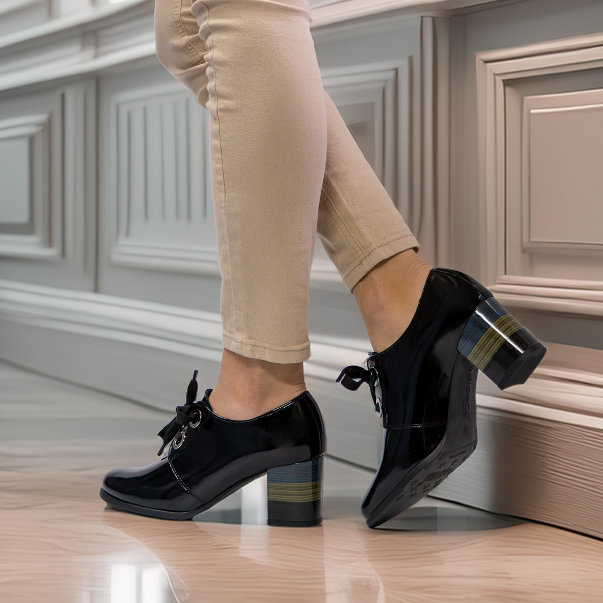 Model: Czarne lakierowane półbuty na kolorowym obcasie