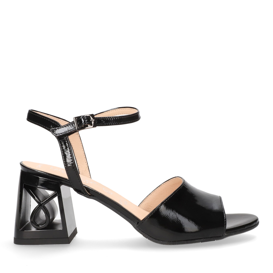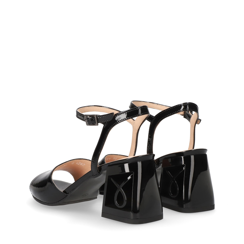 Styl i funkcjonalność: Stabilny 7 cm obcas typu klocek z ozdobnym ażurowym obcasem i regulowanym paskiem, skóra lakierowana w kolorze czarnym i klasyczny fason, pasujący do eleganckich i casualowych stylizacji.