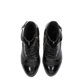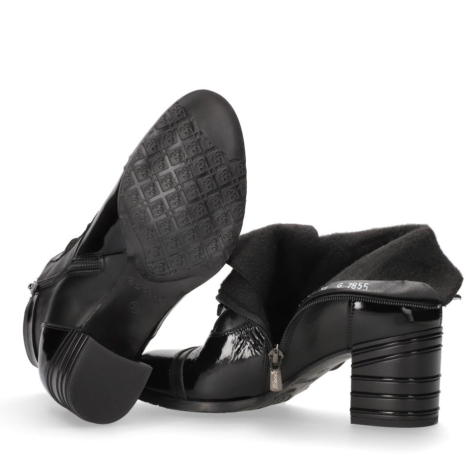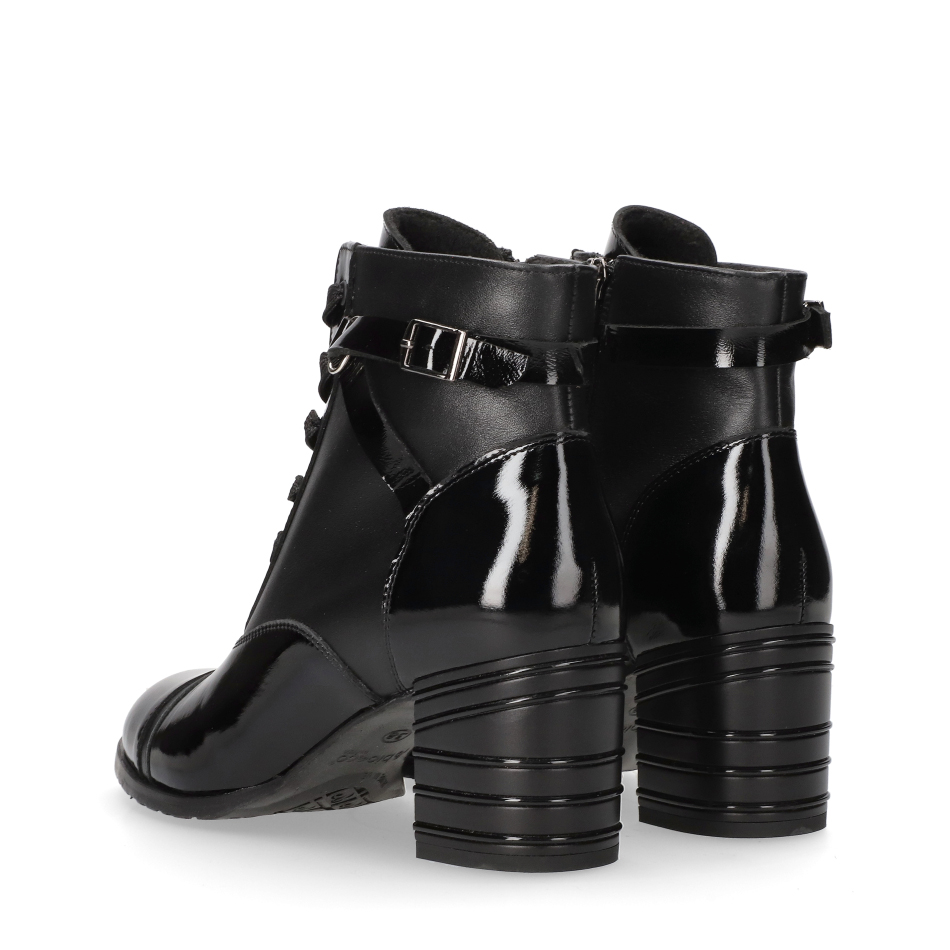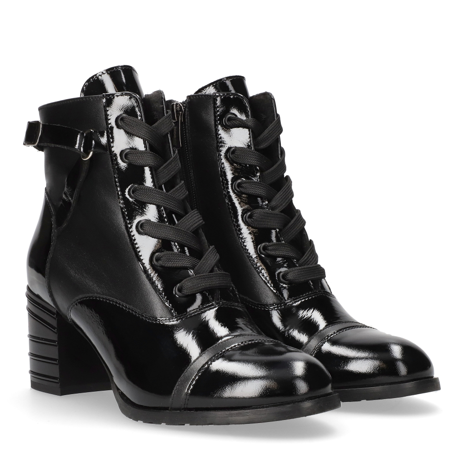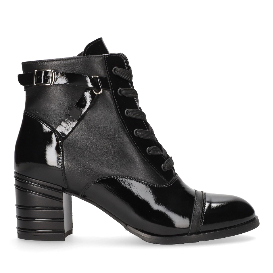 Te czarne botki zostały wykonane z wysokiej jakości skóry licowej, łącząc nowoczesny styl z ponadczasową elegancją. Stabilny obcas typu klocek o wysokości 6,5 cm oraz funkcjonalne sznurowanie i ozdobny pasek z klamerką zapewniają nie tylko atrakcyjny wygląd, ale również wygodę i pewność kroku. Polski produkt, dopracowany w każdym szczególe, zachwyca precyzją wykonania oraz trwałością materiałów.