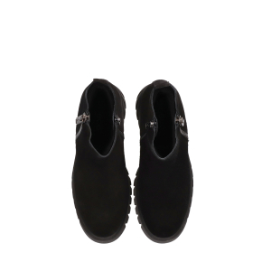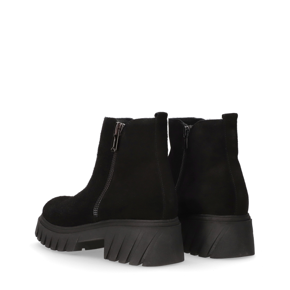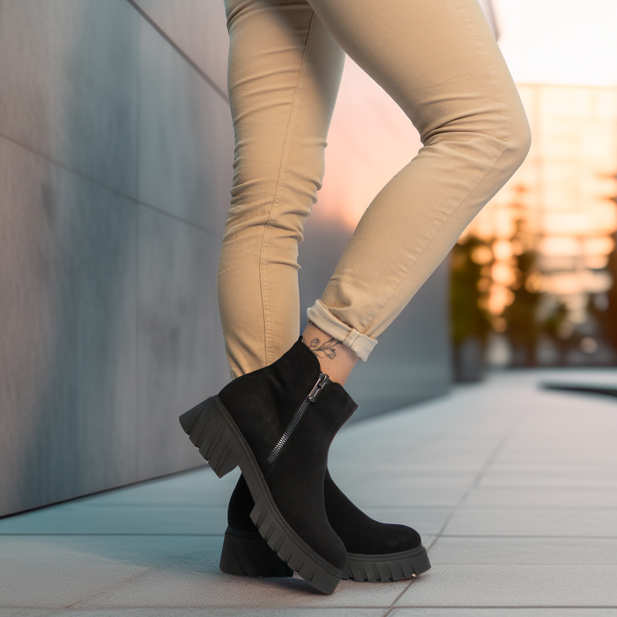 Te czarne botki to idealny wybór dla miłośniczek wygody i wyrazistego, miejskiego stylu. Wykonane z miękkiego nubuku w głębokiej czerni, osadzone są na masywnej, traperowej podeszwie, która jest obecnie hitem mody. Ozdobny, ukośny zamek błyskawiczny nie tylko ułatwia zakładanie, ale także stanowi modny, metaliczny akcent.