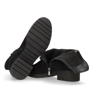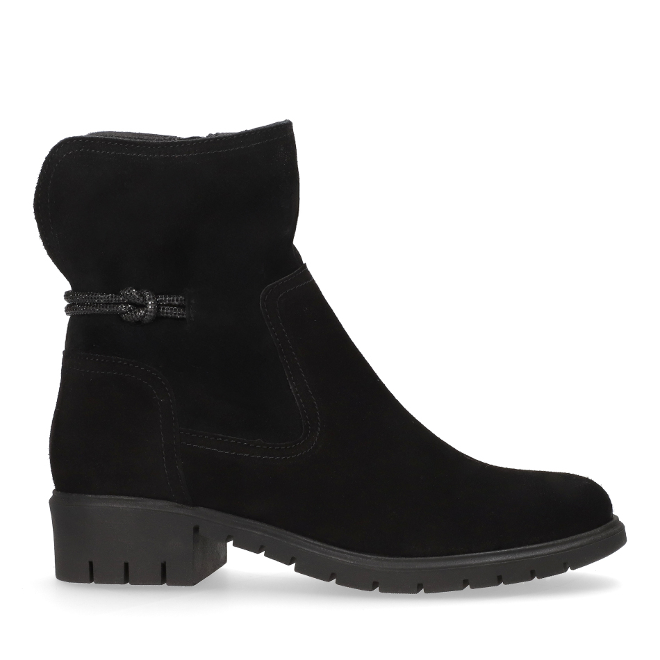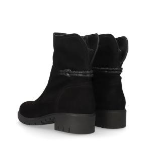 Styl i funkcjonalność – czarny welur w klasycznej formie, dekoracyjny sznurek przy cholewce i stabilna traperowa podeszwa.