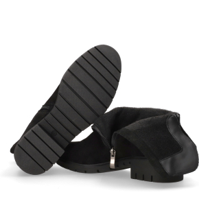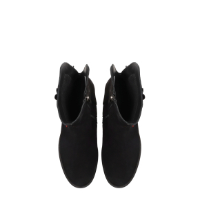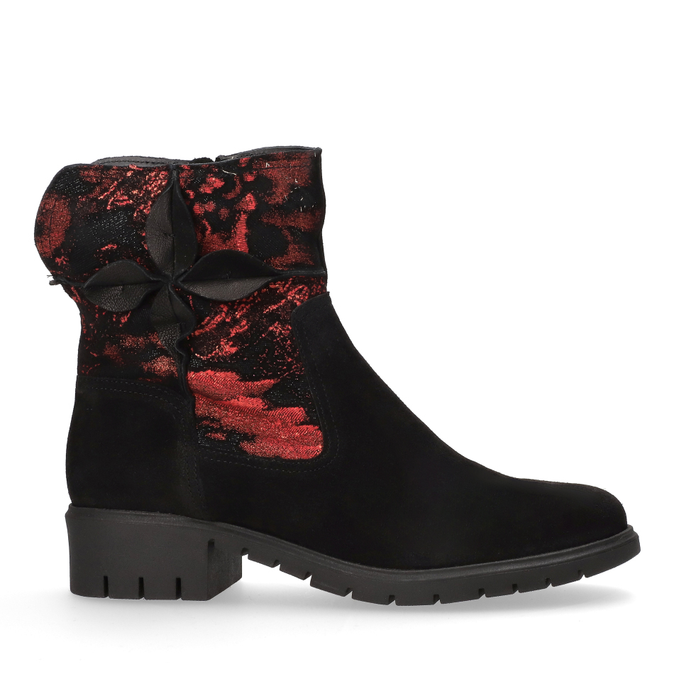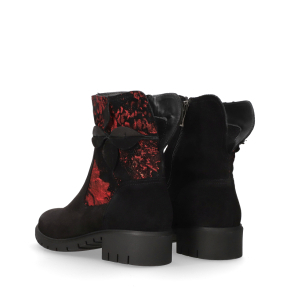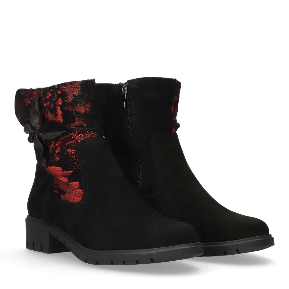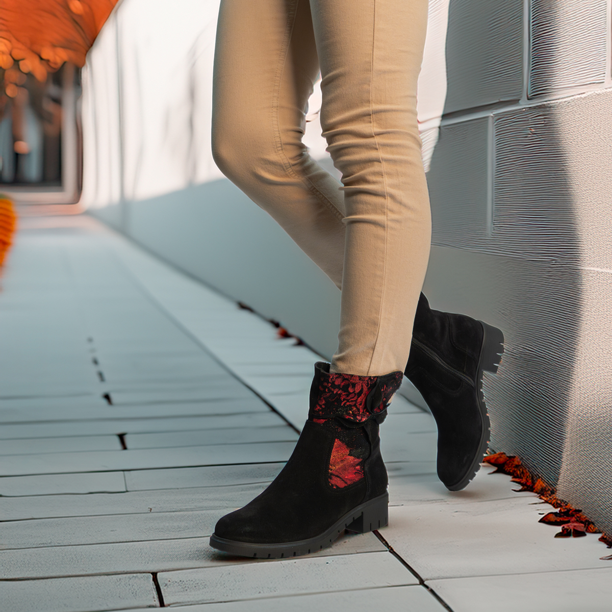 Te czarne botki to propozycja dla kobiet, które cenią sobie komfort, ale nie chcą rezygnować z modnego i wyrazistego designu. Wykonane z dwoiny, łączą klasyczną czerń z kontrastowym, efektownym wzorem na cholewce. Czerwono-czarny, lekko połyskujący print oraz urocza skórzana aplikacja w kształcie kwiatu na boku sprawiają, że botki te stanowią unikalny dodatek do jesiennych i zimowych stylizacji.