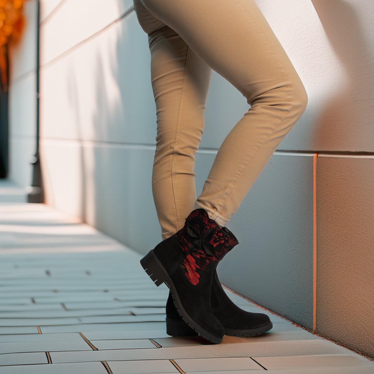 Czarne Botki Z Dwoiny Z Kwietnym Akcentem – Wygoda I Wyrazisty Styl