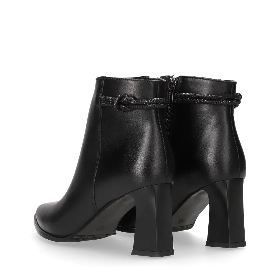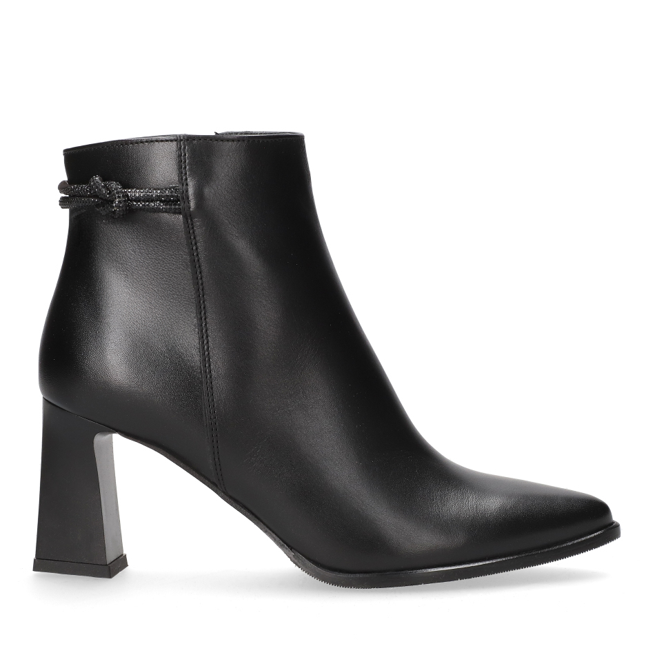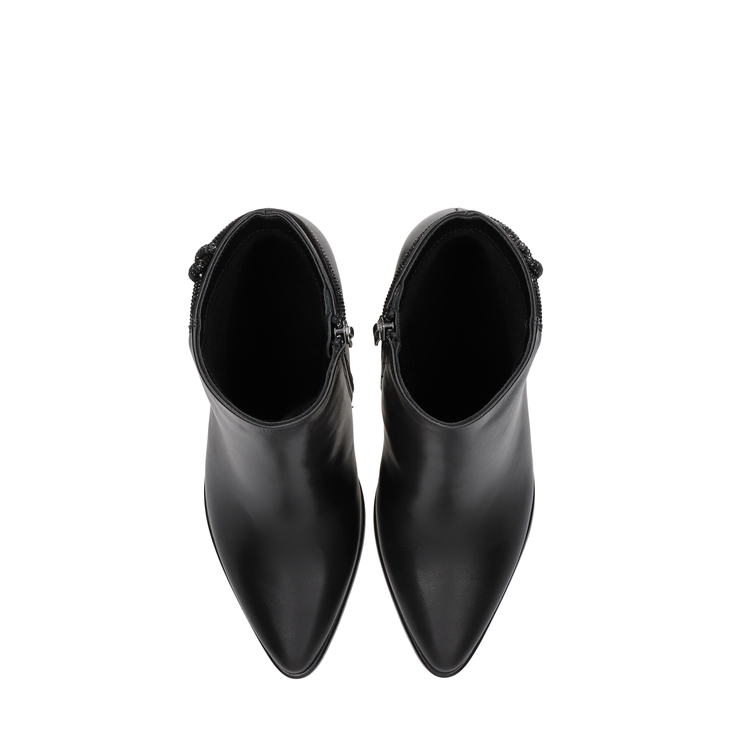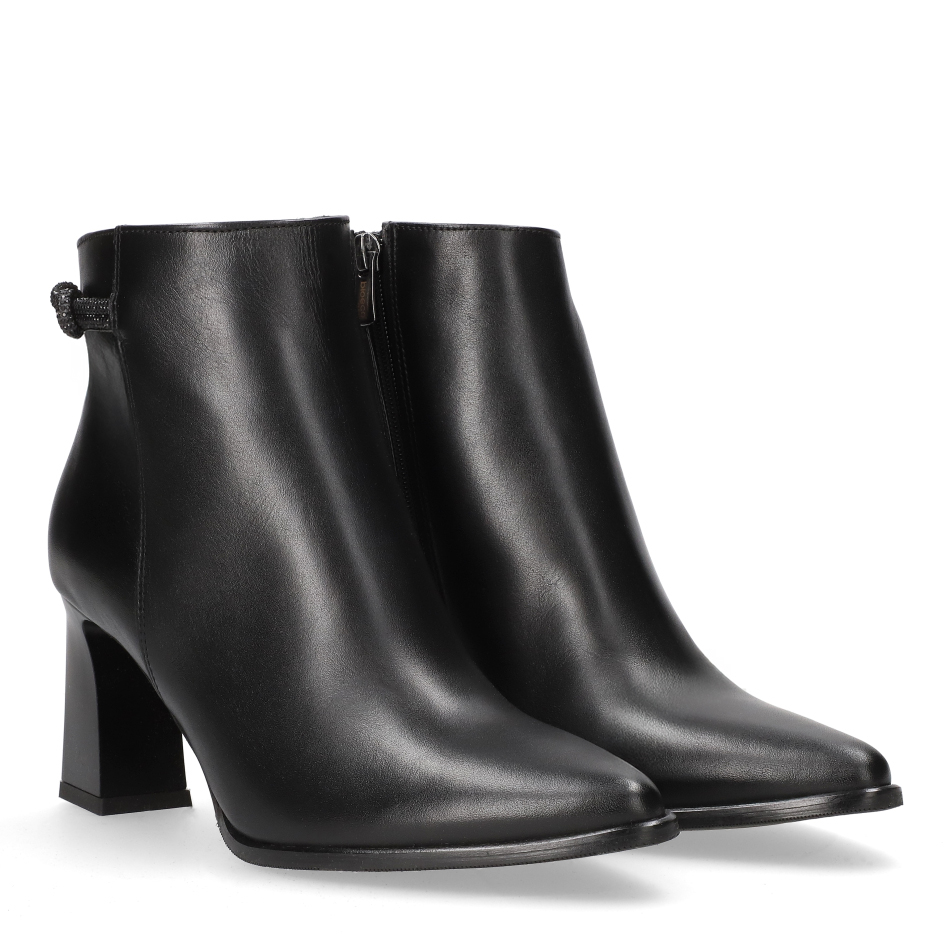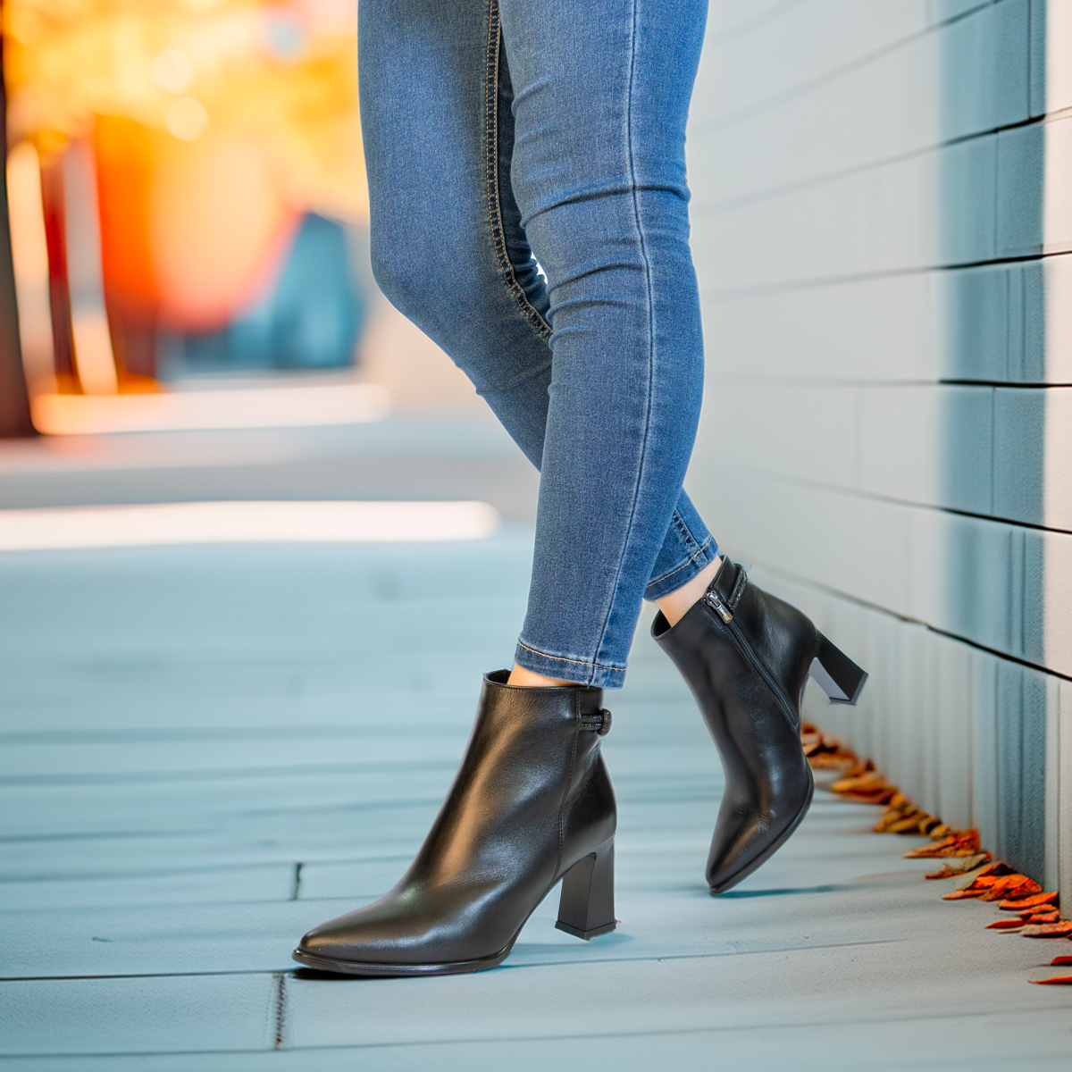 Te klasyczne czarne botki wykonano z naturalnej licowej skóry, zapewniając wytrzymałość i luksusowy wygląd na długie sezony. Wysoki, stabilny obcas typu słupek o wysokości 8,5 cm gwarantuje efektowne wysmuklenie sylwetki przy zachowaniu pewności i wygody chodzenia. Minimalistyczny design został urozmaicony subtelną ozdobą z tyłu cholewki, co podkreśla nowoczesny charakter buta.