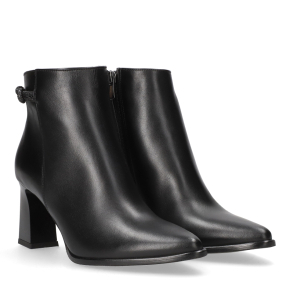 Klasyczny fason – czarna licowa skóra, prosty obcas typu słupek oraz delikatna ozdoba na cholewce czynią model uniwersalnym i wszechstronnym.