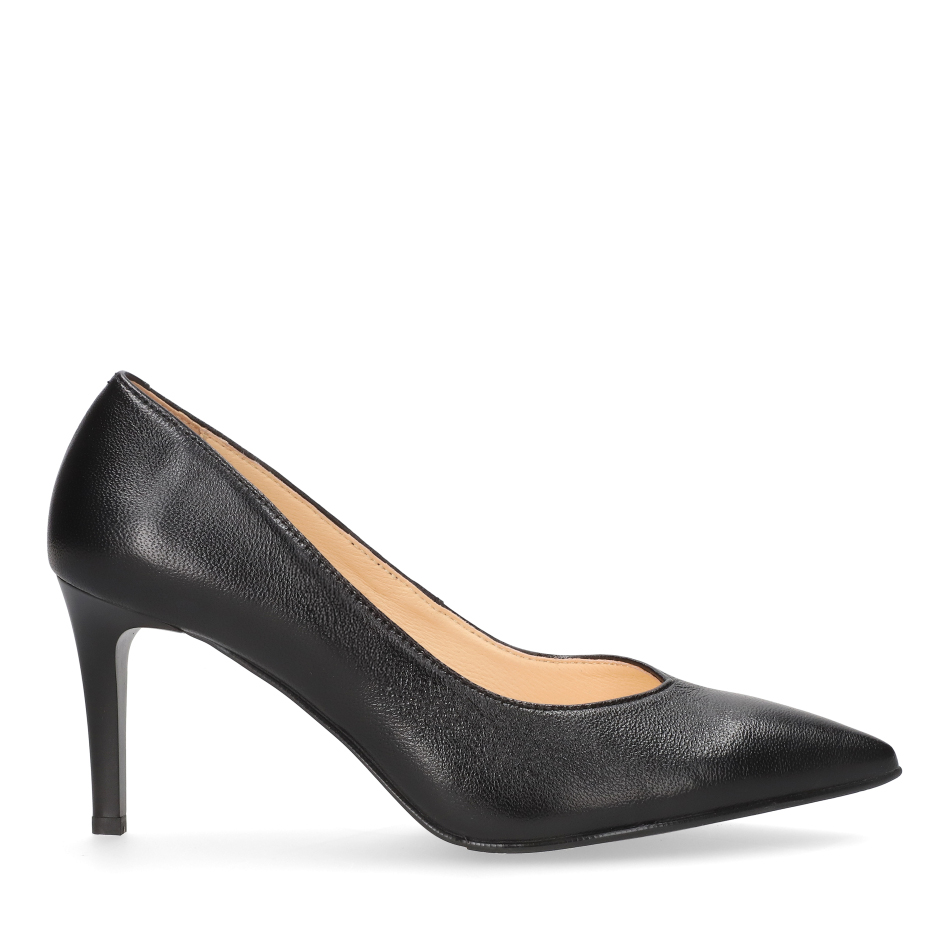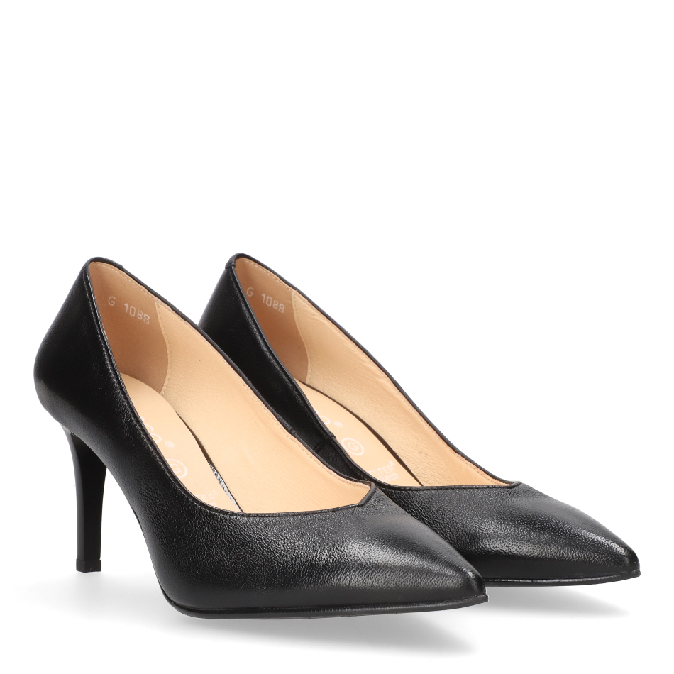 Styl i funkcjonalność: Stabilny 7 cm obcas typu szpilka, skóra licowa w kolorze czarnym oraz klasyczny fason z noskiem w szpic, pasujący do eleganckich i casualowych stylizacji.