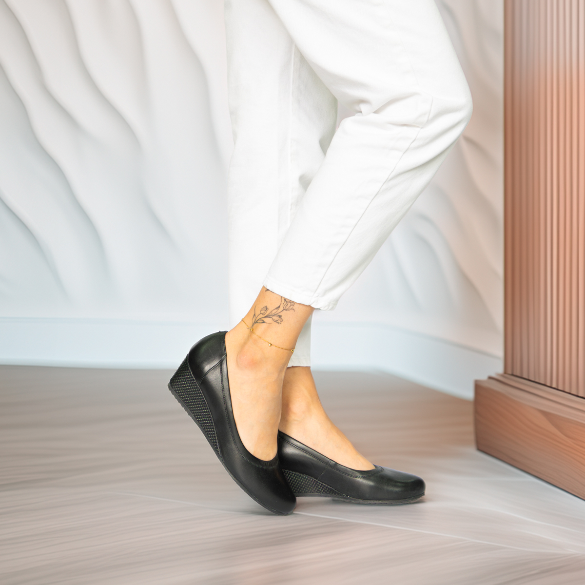 Styl i funkcjonalność: Stabilny 4,5 cm obcas typu klin, skóra licowa w kolorze czarnym z ozdobnym detalem, pasujący do eleganckich i casualowych stylizacji.