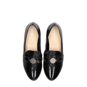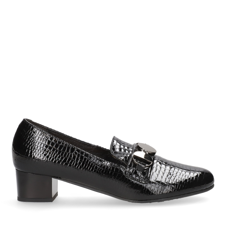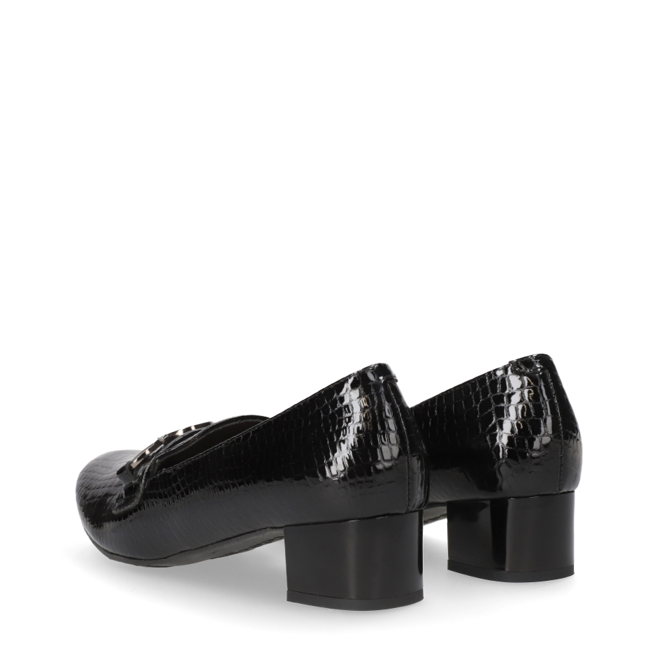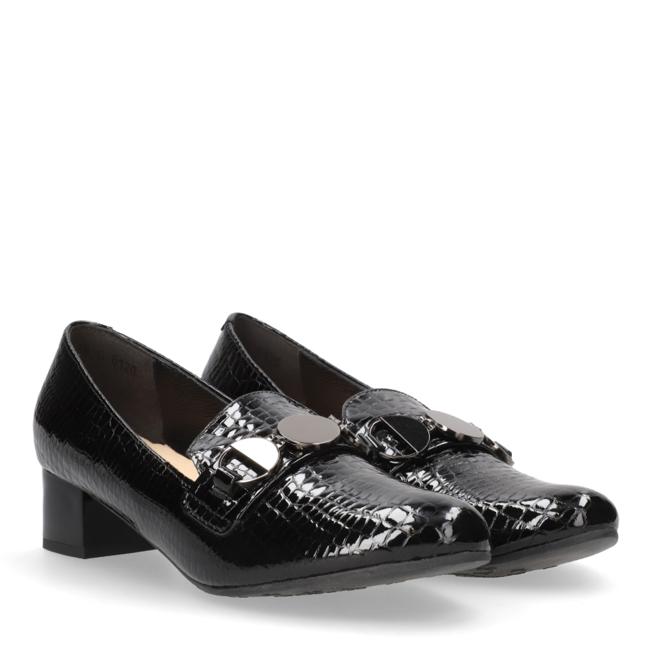 Styl i funkcjonalność: Stabilny 4 cm obcas typu klocek z ozdobną metalową klamrą na podbiciu, lakierowana skóra w kolorze czarnym i elegancki fason, pasujący do stylizacji biurowych i casualowych.